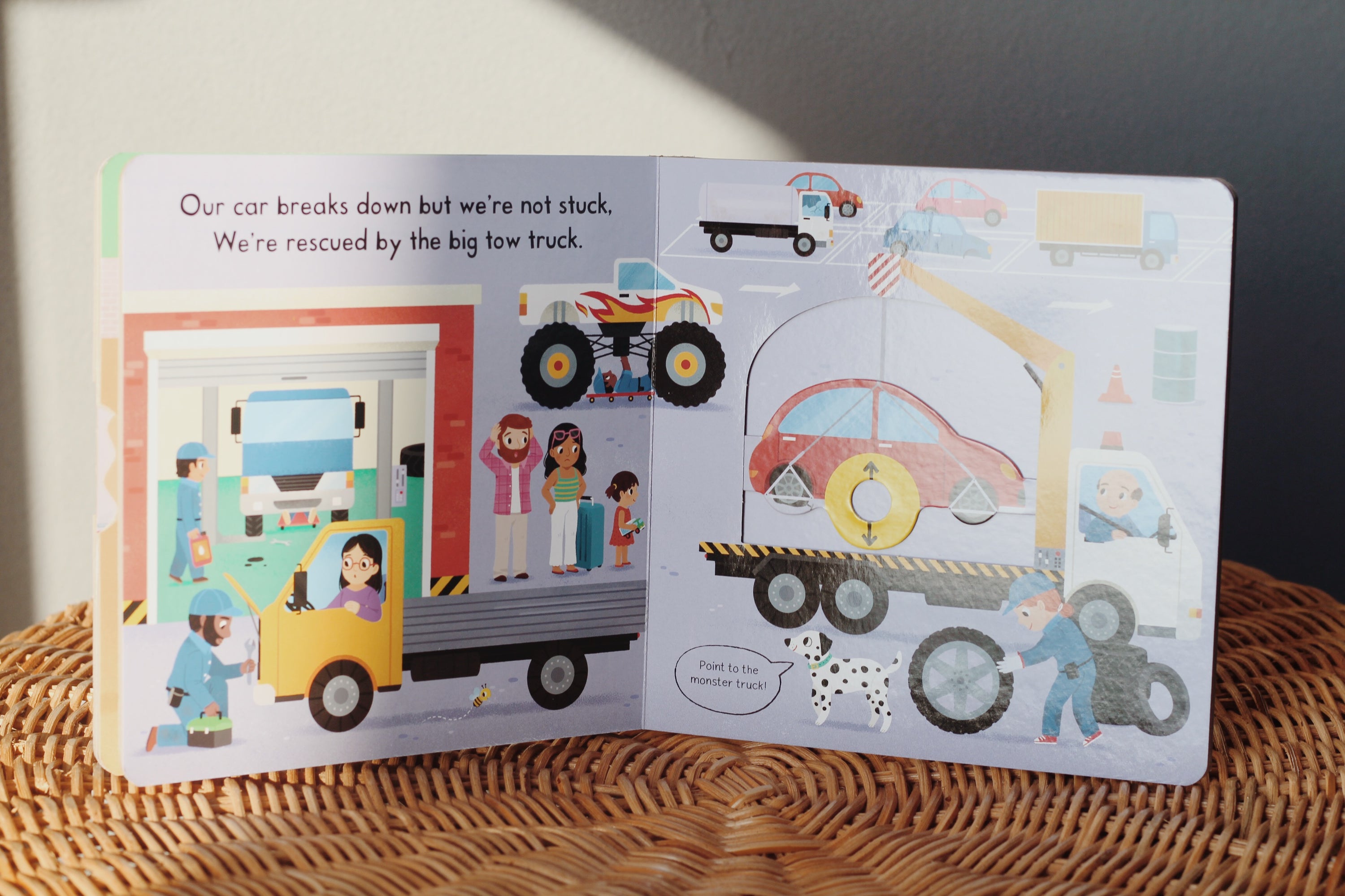 Push, pull and slide the tabs to help the Busy Trucks with their important jobs! Collect the recycling, dump the rubble and tow the broken-down car to the garage.