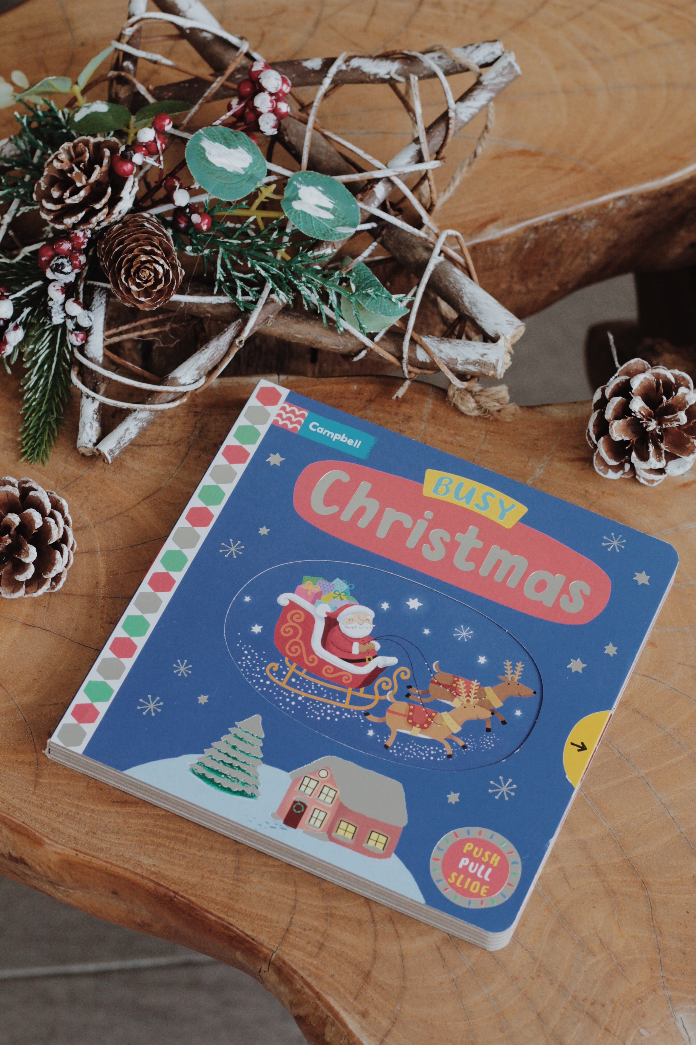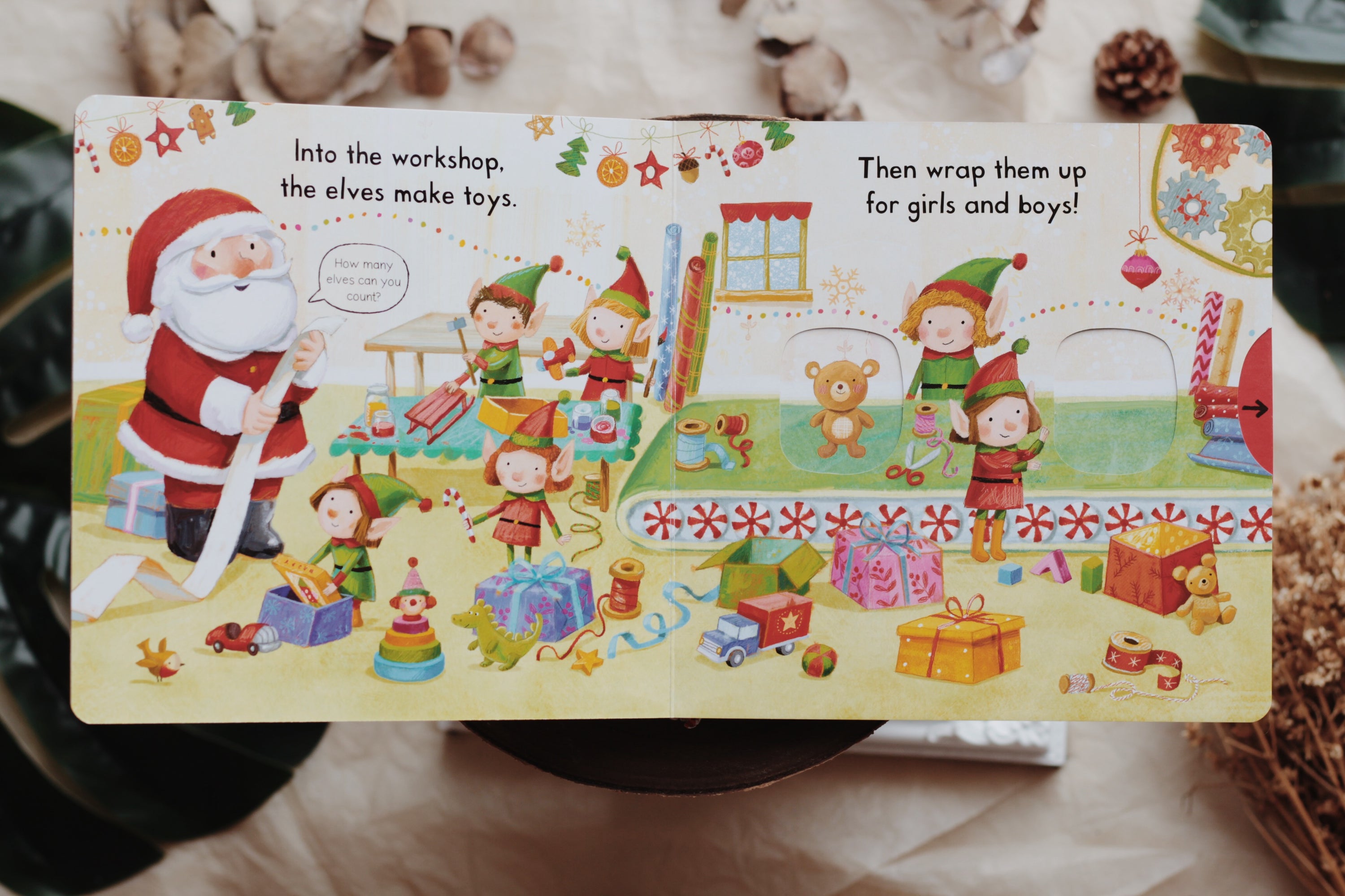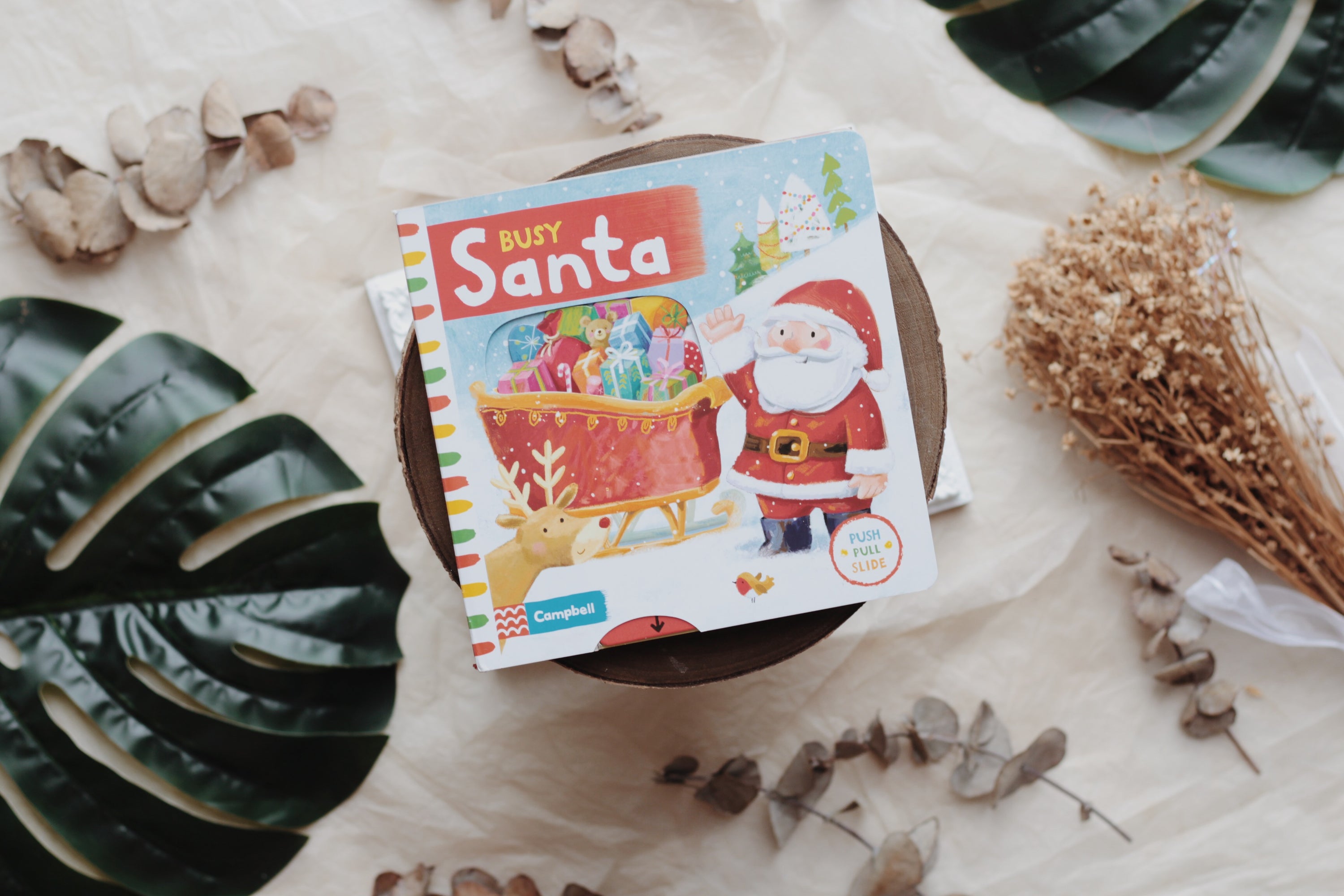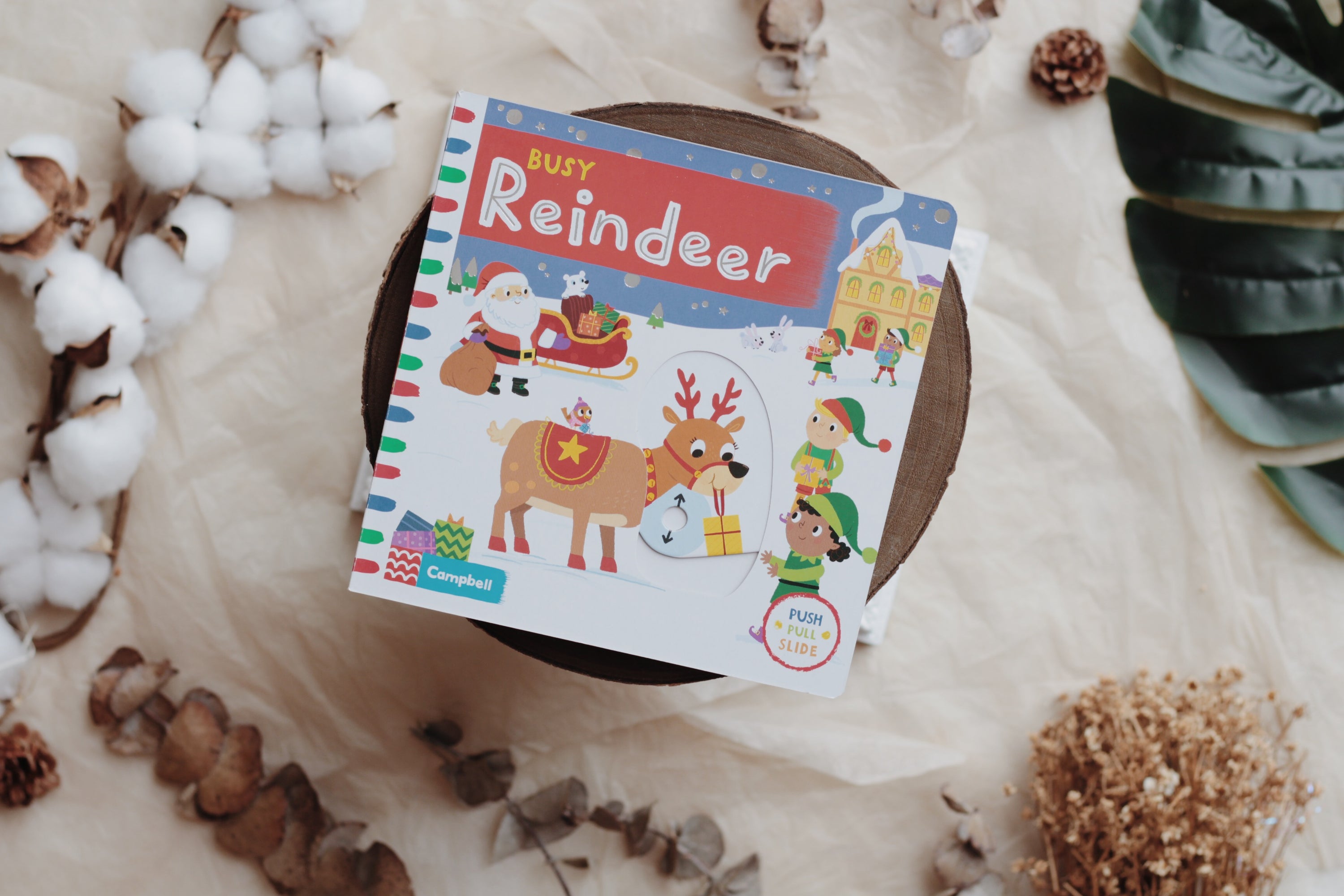 Santa's got a busy day ahead and you can join in the festive fun! In Busy Santa, young children can push, pull and turn the tabs to help him wrap up the presents, load up the sleigh, fly through the sky and deliver all the parcels on Christmas Eve.