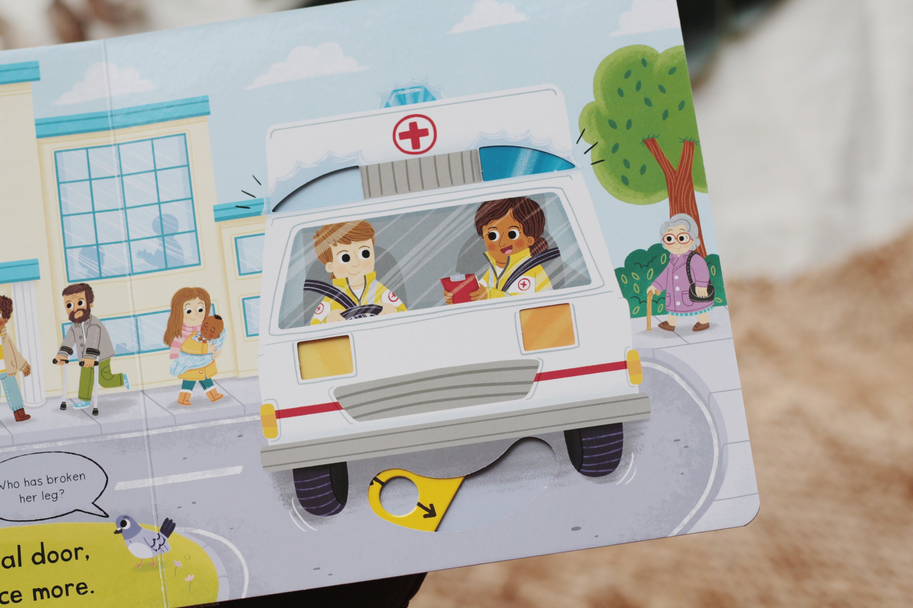 Push, pull and slide the tabs to help the Busy Ambulance on its way! Join the ambulance crew as they hurry to an accident before racing to hospital, with flashing lights and a noisy siren.