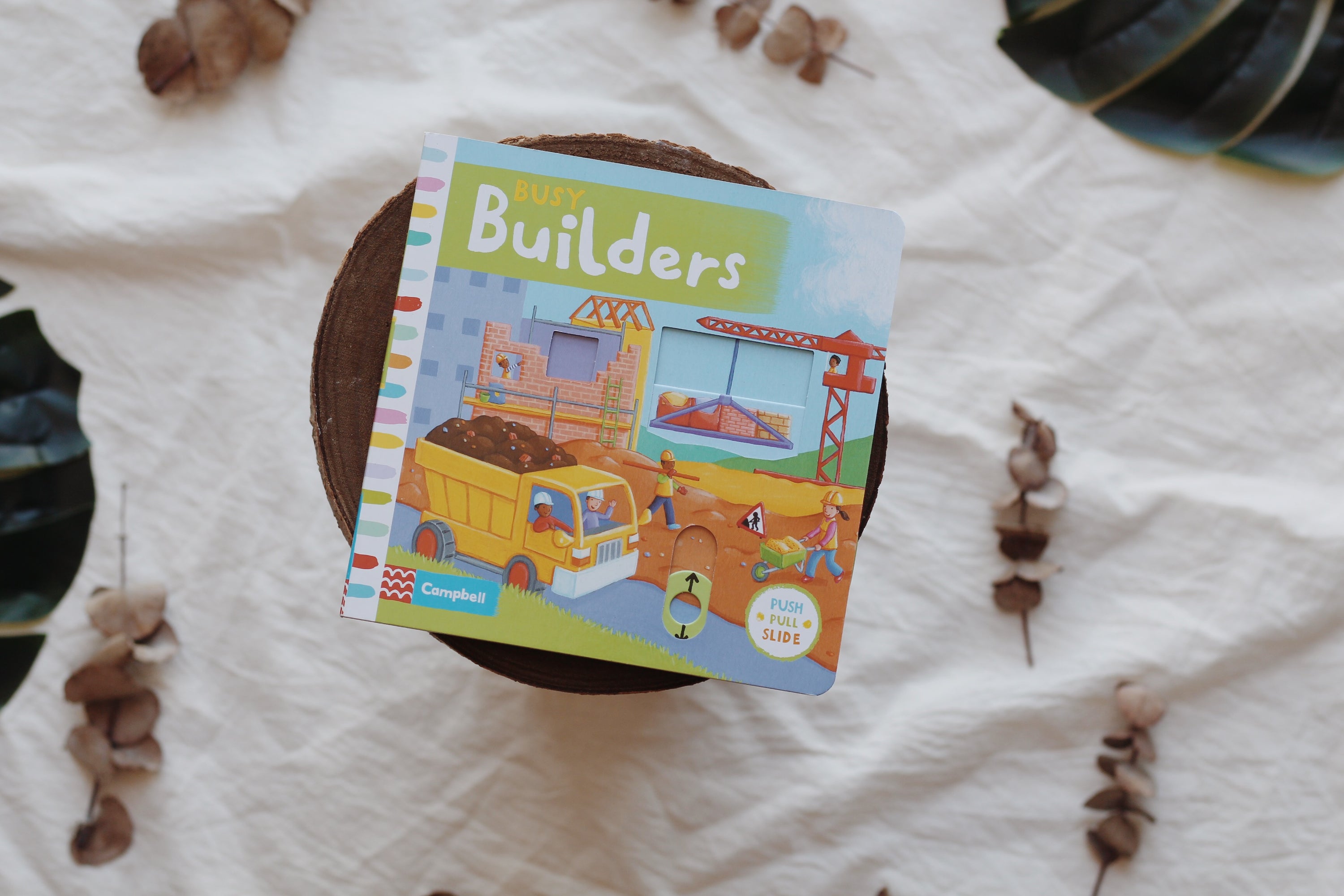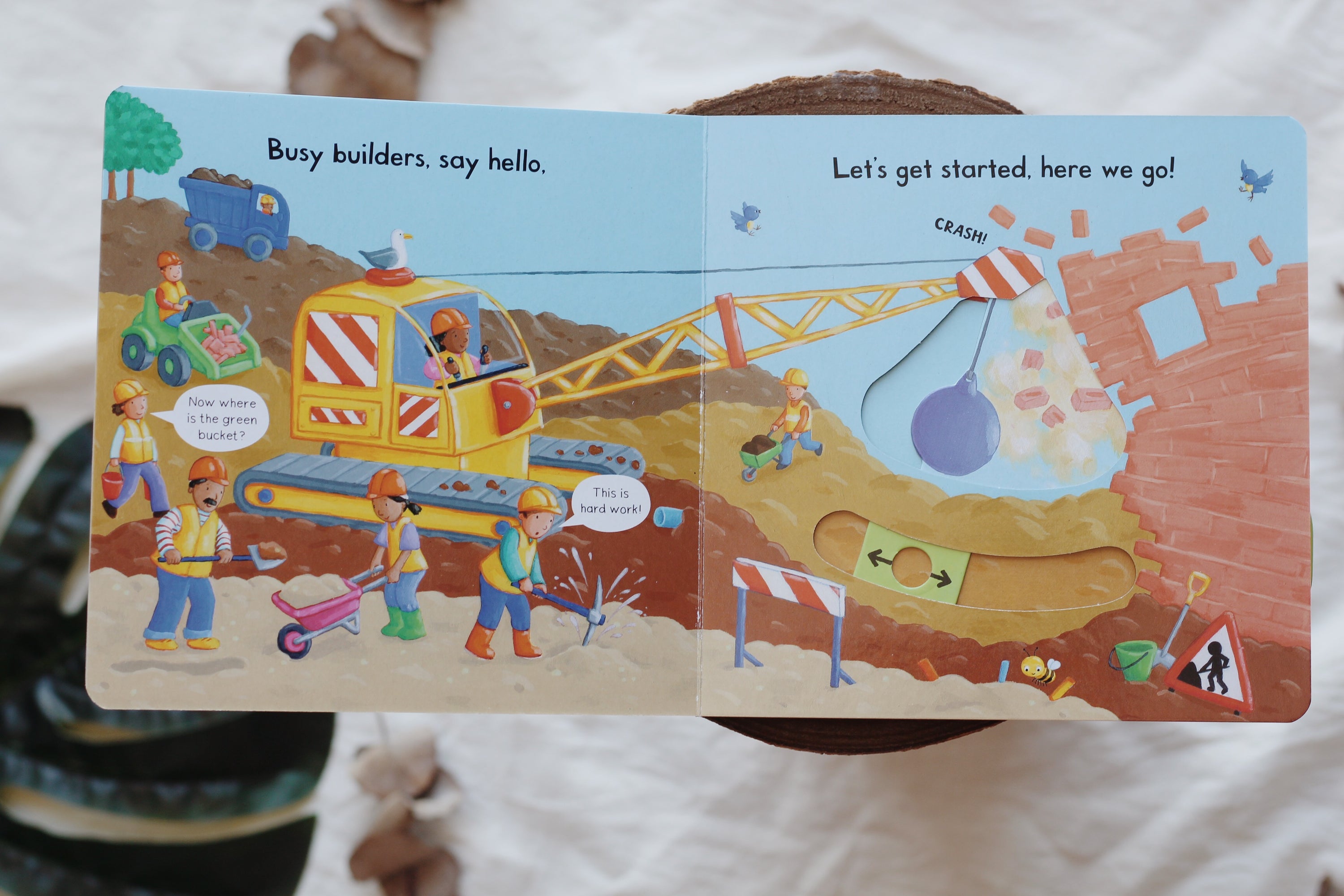 With lots to see and heaps to do, in Busy Builders young children really can join in by pushing, pulling and turning the tabs to bring the building site to life. Climb a ladder, make a crane lift heavy loads high up into the sky, then knock down a building with a giant wrecking ball.