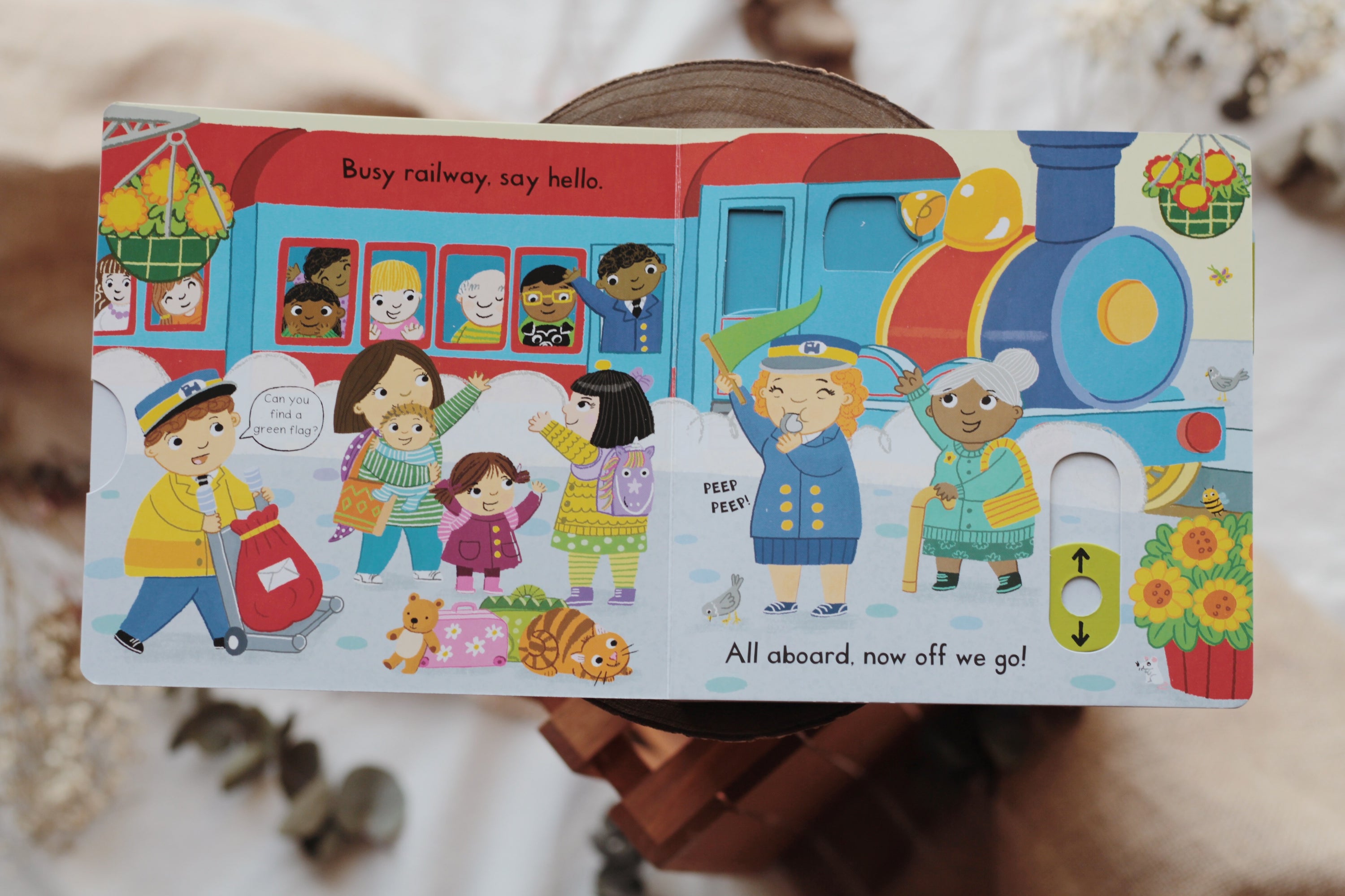With lots to see and heaps to do, children really can join in by pushing, pulling and turning the tabs to bring the railway to life. Move guard rails up and down, watch smoke puff out of the funnel and drive trains in and out of the tunnel.ย