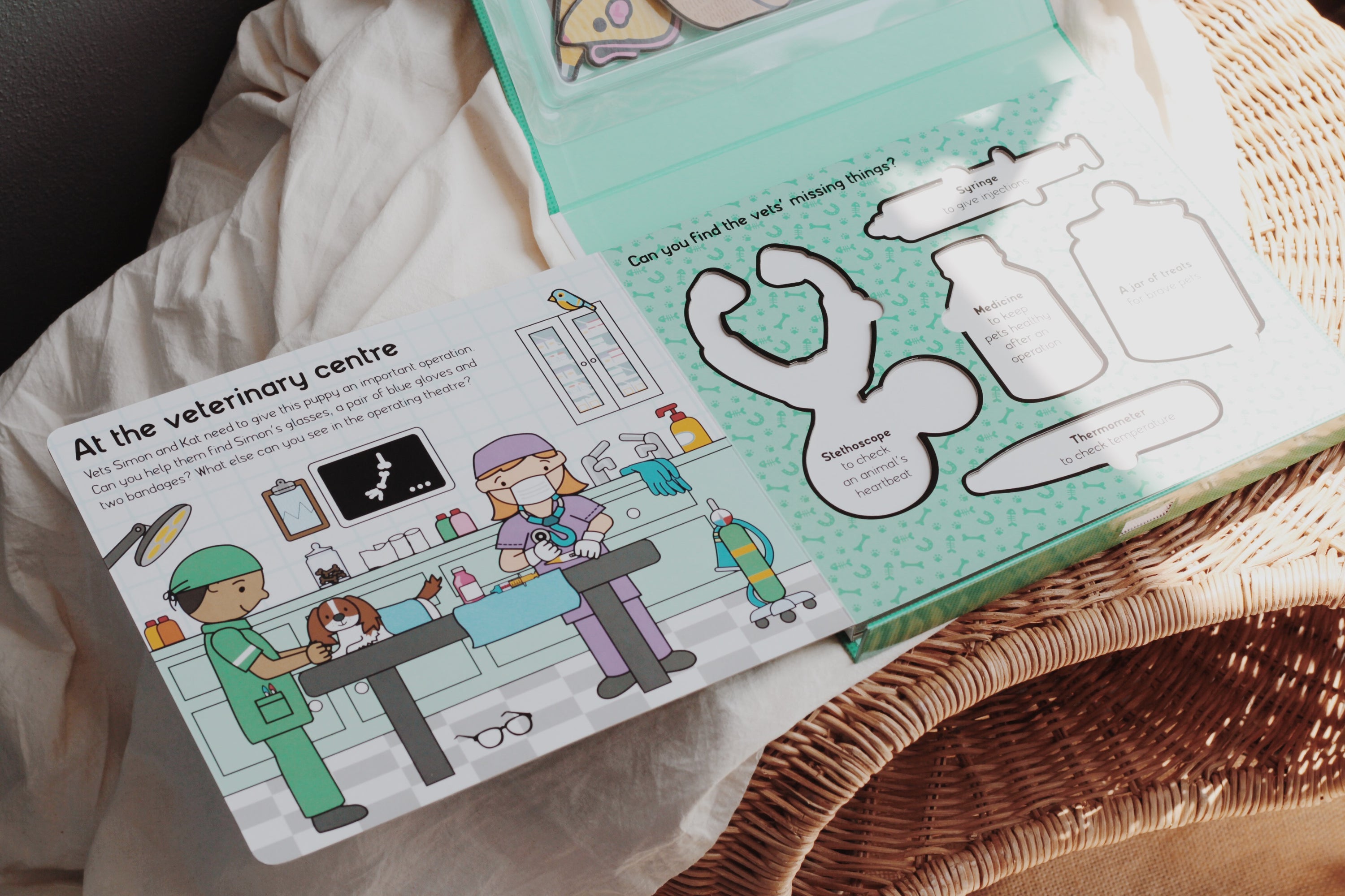It's another busy day for vets Kat and Simon and the Rescue Centre volunteers! Inside this creative play set, the big board book has three busy scenes full of things to look for and find, as the vets prepare a puppy for an operation, Kat takes a trip to Buttercup Farm to treat a sick horse, and volunteers Joey and Jill get two kittens ready to go to a new home.