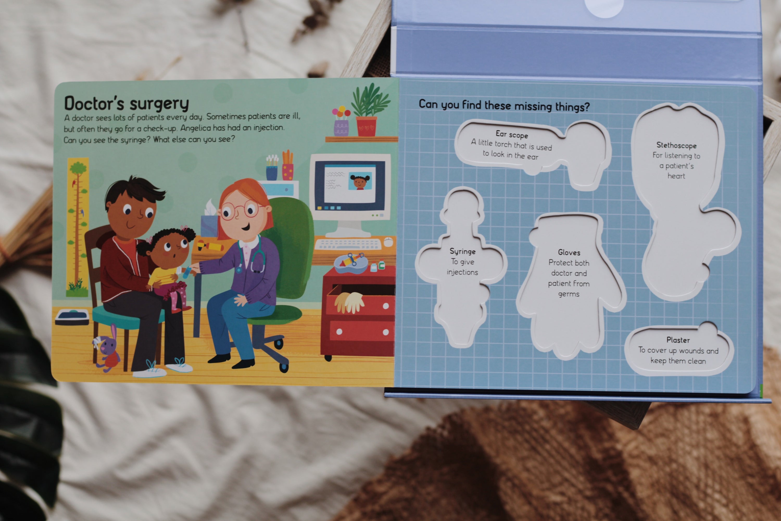 Let's Pretend Doctor's Bag is the perfect creative play set for inquisitive children. Each set includes a board book with busy scenes full of objects to see and find, plus 15 chunky puzzle pieces to place in the book pages.