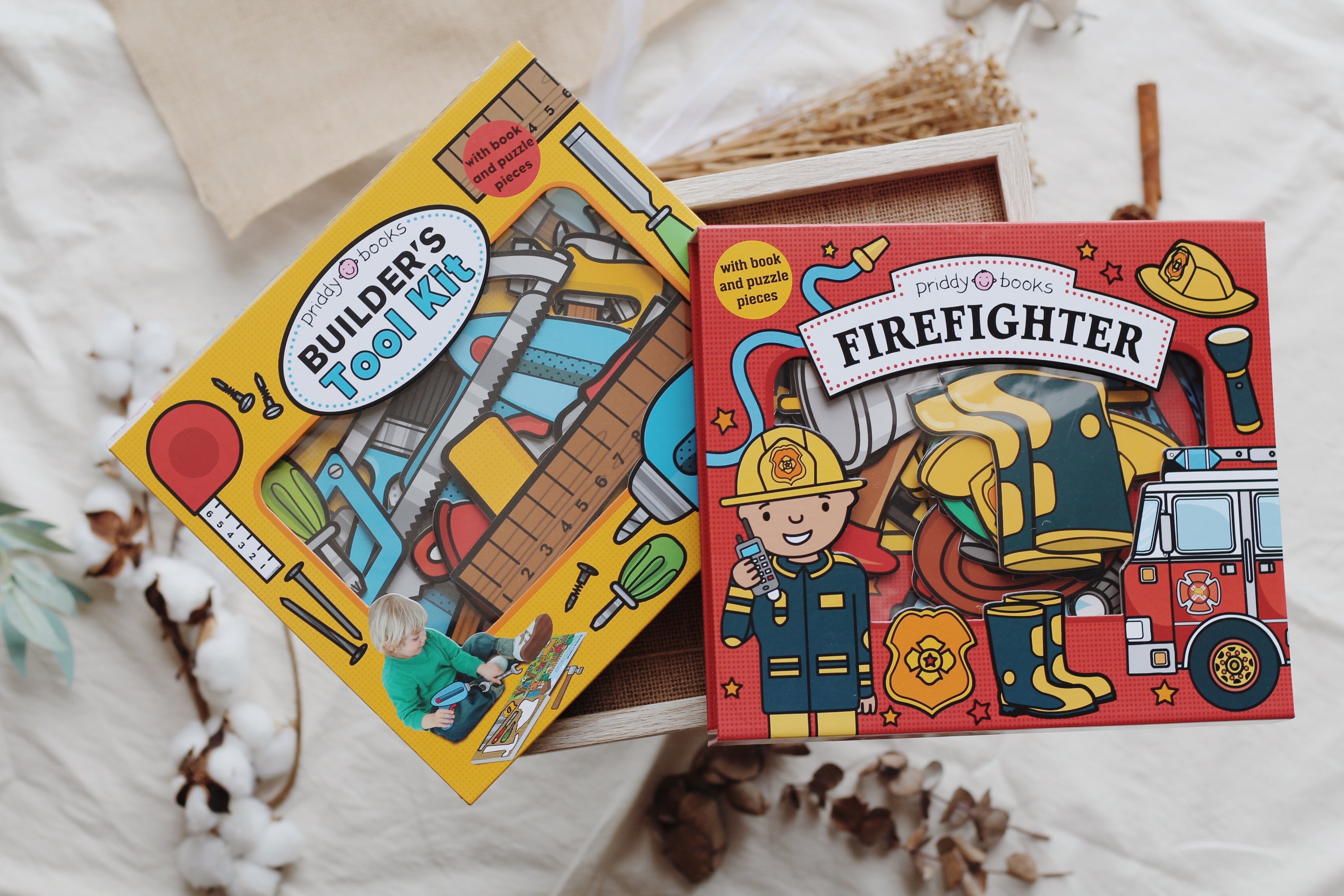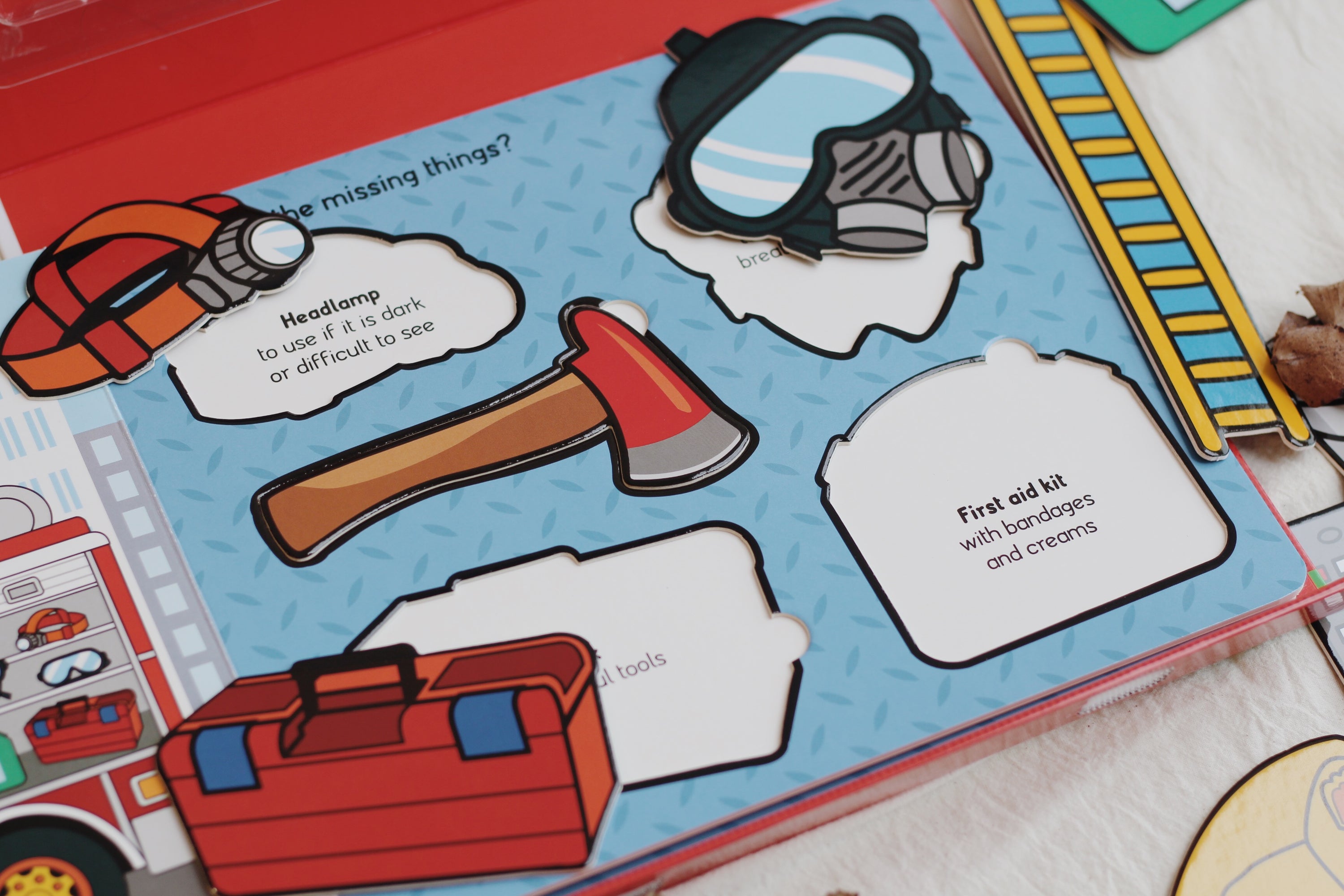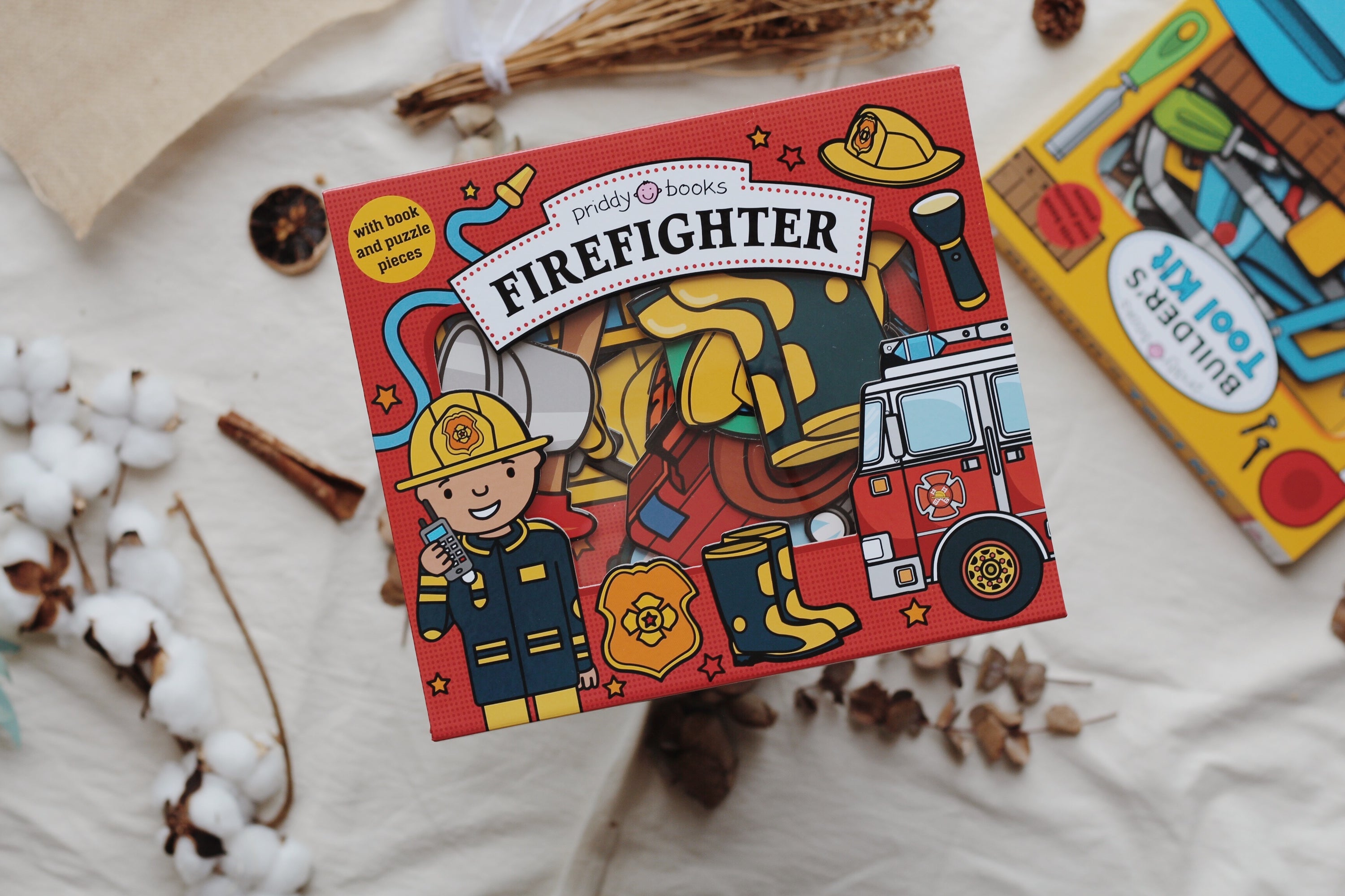 Inside this creative play set, the big board book has three busy scenes as firefighters Ben and Lucy gather their equipment, zoom off in their truck, and fight a fire at the bakery, keeping everyone safe. The set comes with 15 sturdy fire fighting puzzle pieces which can be used both to match to the spaces on the book pages and for independent play.