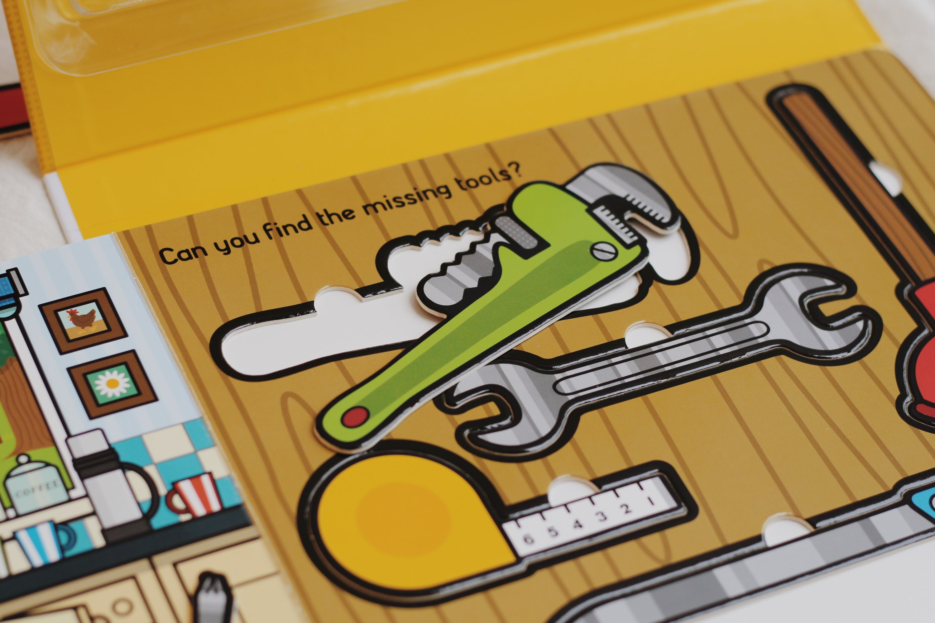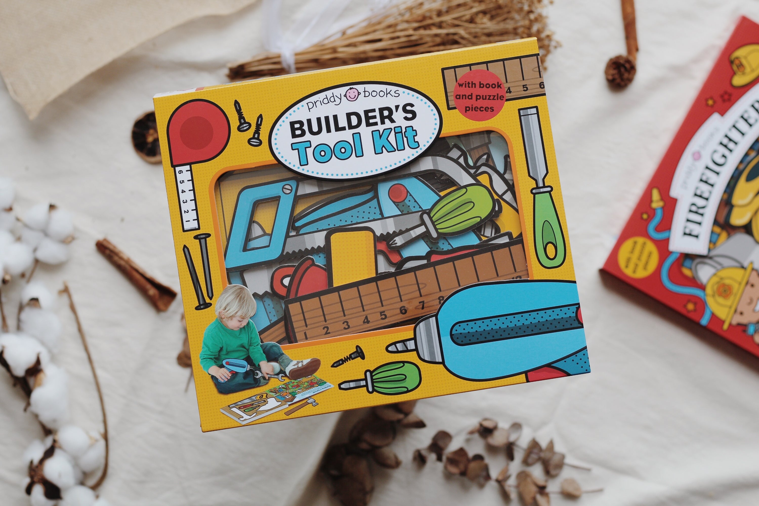 A large format board book from Roger Priddy, Let's Pretend Builders Tool Kit--perfect for the little builders in your life! This book and kit contains a full set of tools to allow curious builders to start building right away. Sturdy press-out pieces provide hours of creative, imaginative play, plus the included tools will allow children to make their own creations.