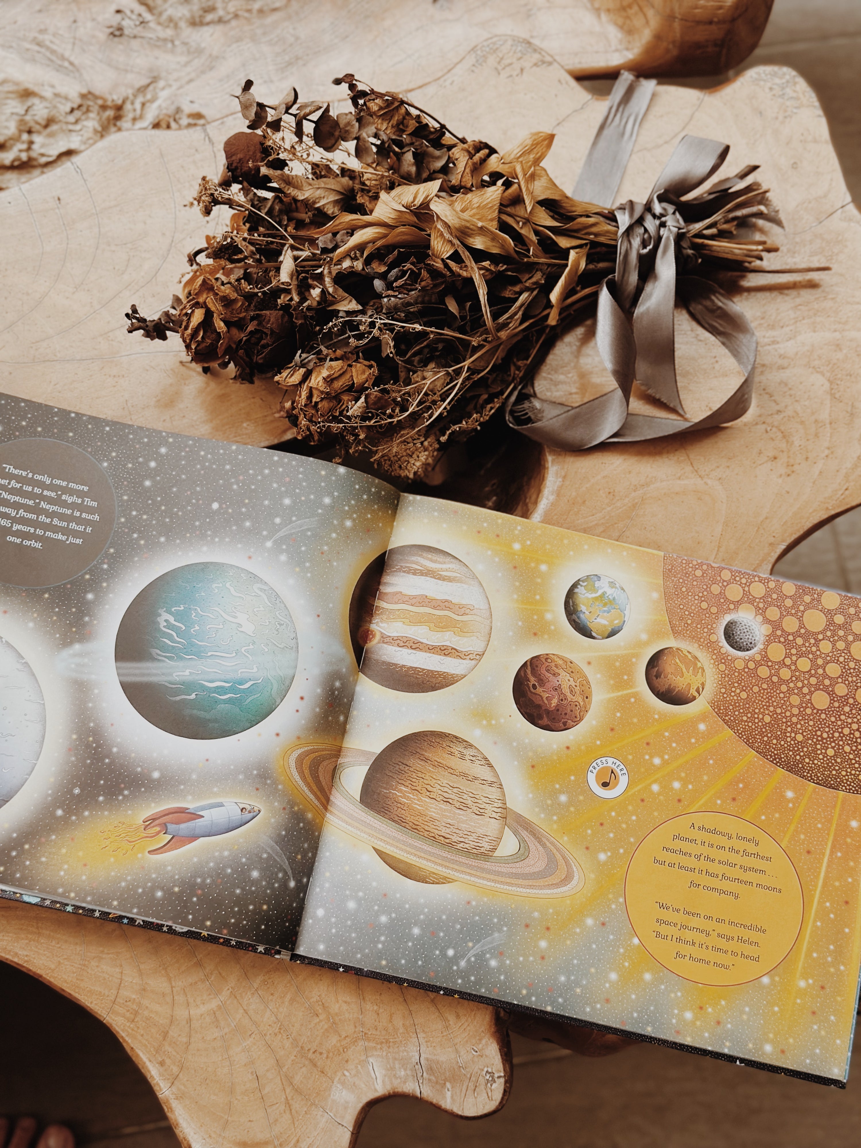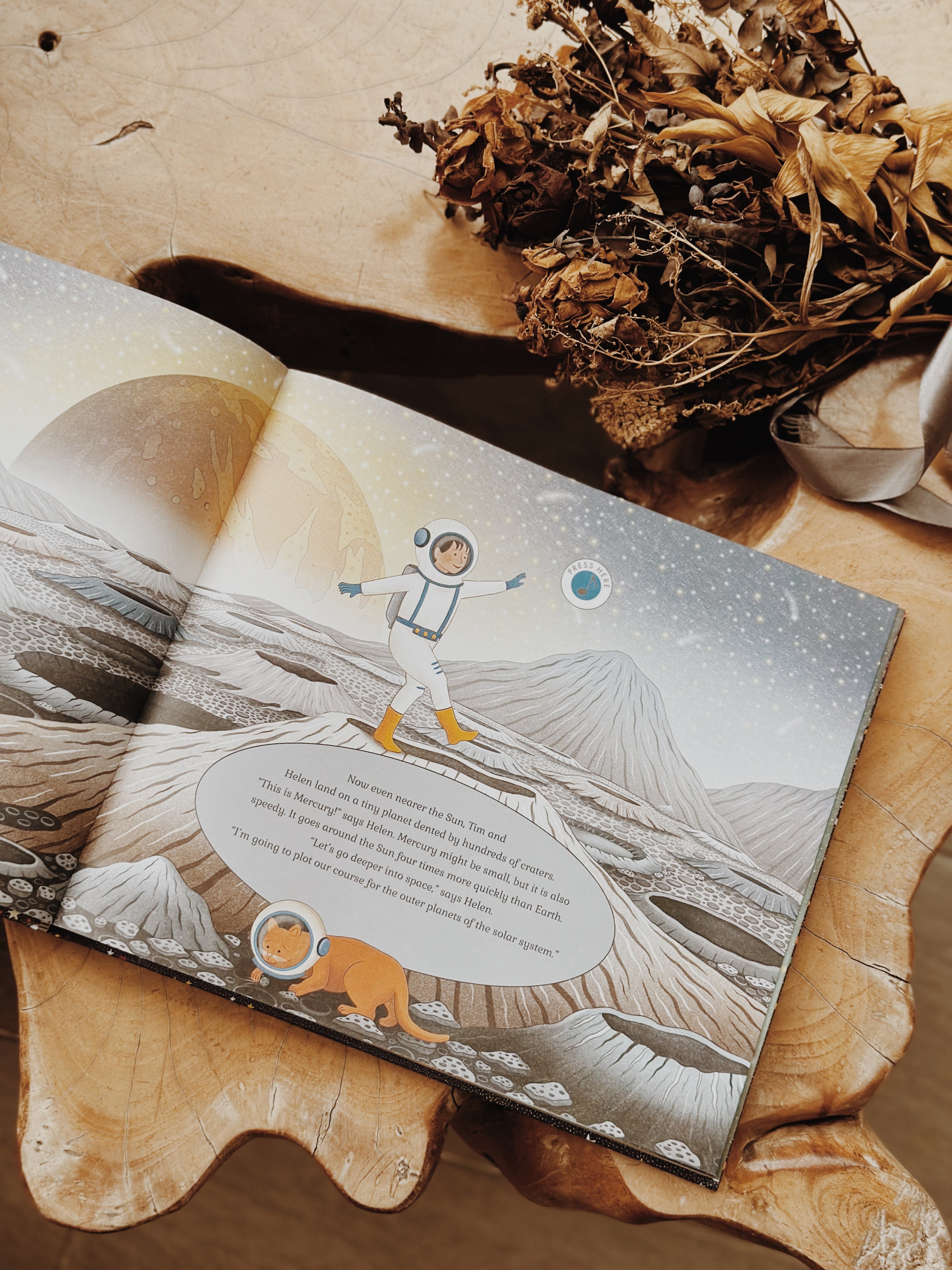 Thisย tale is about a brother and sister who adventure deep into our solar system.ย Our story begins one night as Helen and Tim get ready for bed in their new space rocket bunk bedsโฆ but sleep will have to wait as they magically blast up, up, up into the glittering night sky, leaving planet Earth far below them. Helen and Tim journey here, there and everywhere through our majestic solar system. They soar pastย the cold rocky surface of Mars as it rises into towering peaks and plunges into deep canyons and glide through a bumpy asteroid belt made of icy rocks.ย They blast deeper into our solar system, exploring the dazzling stars and astounding planets along the way. But now it really is time to head home!ย As the rocket speeds towards Earth, Tim and Helen watch the sun rise over their planet.