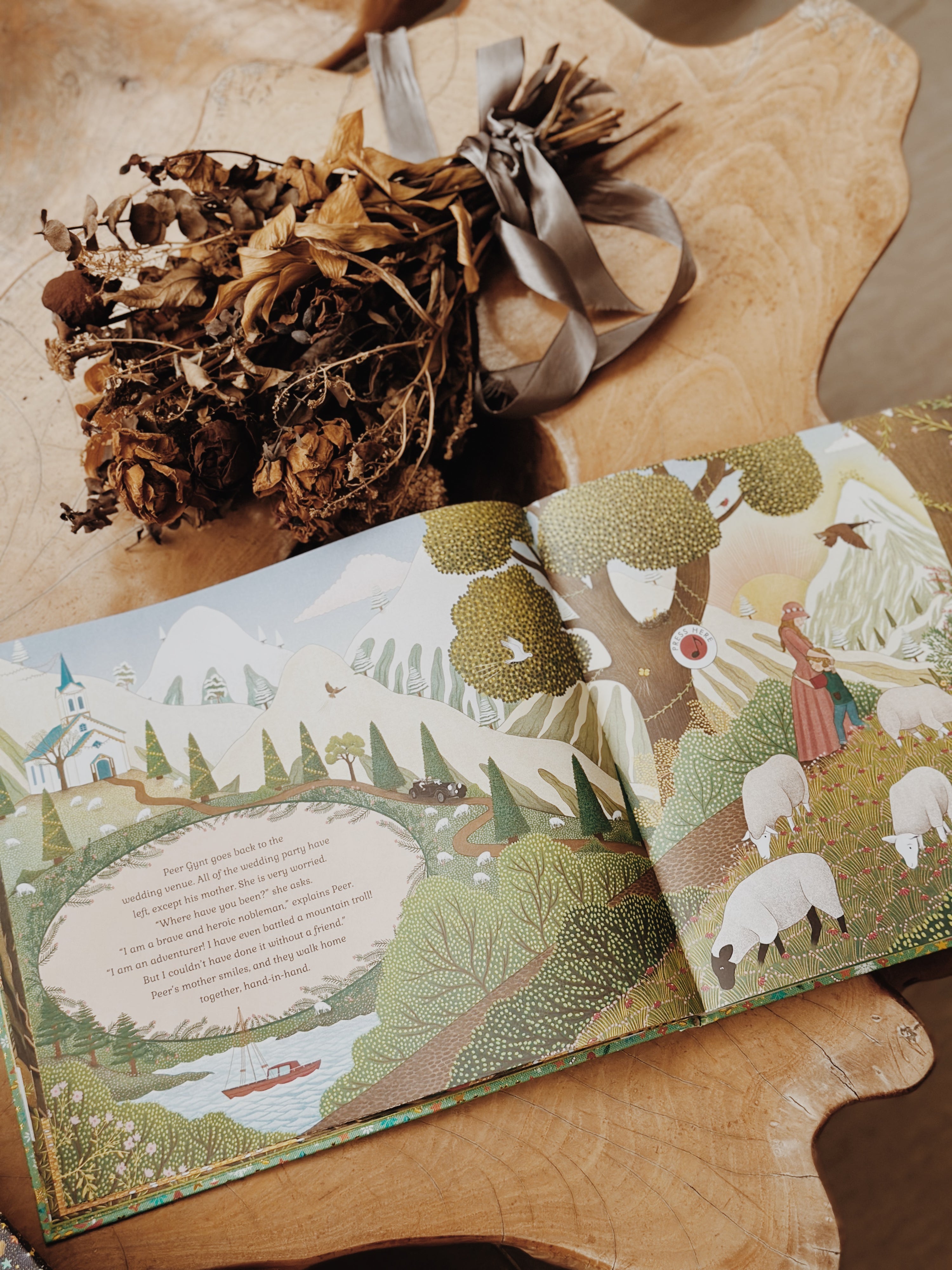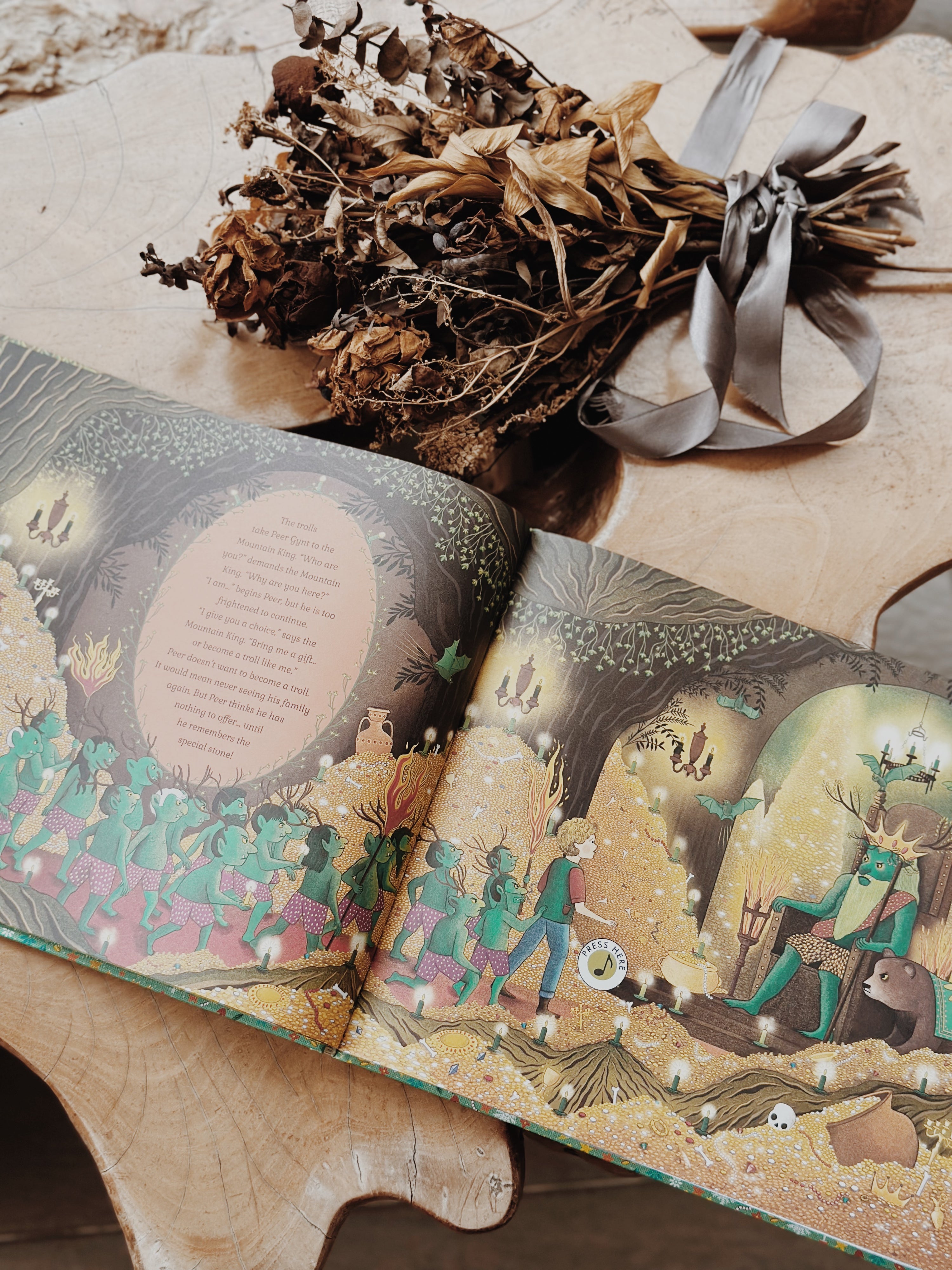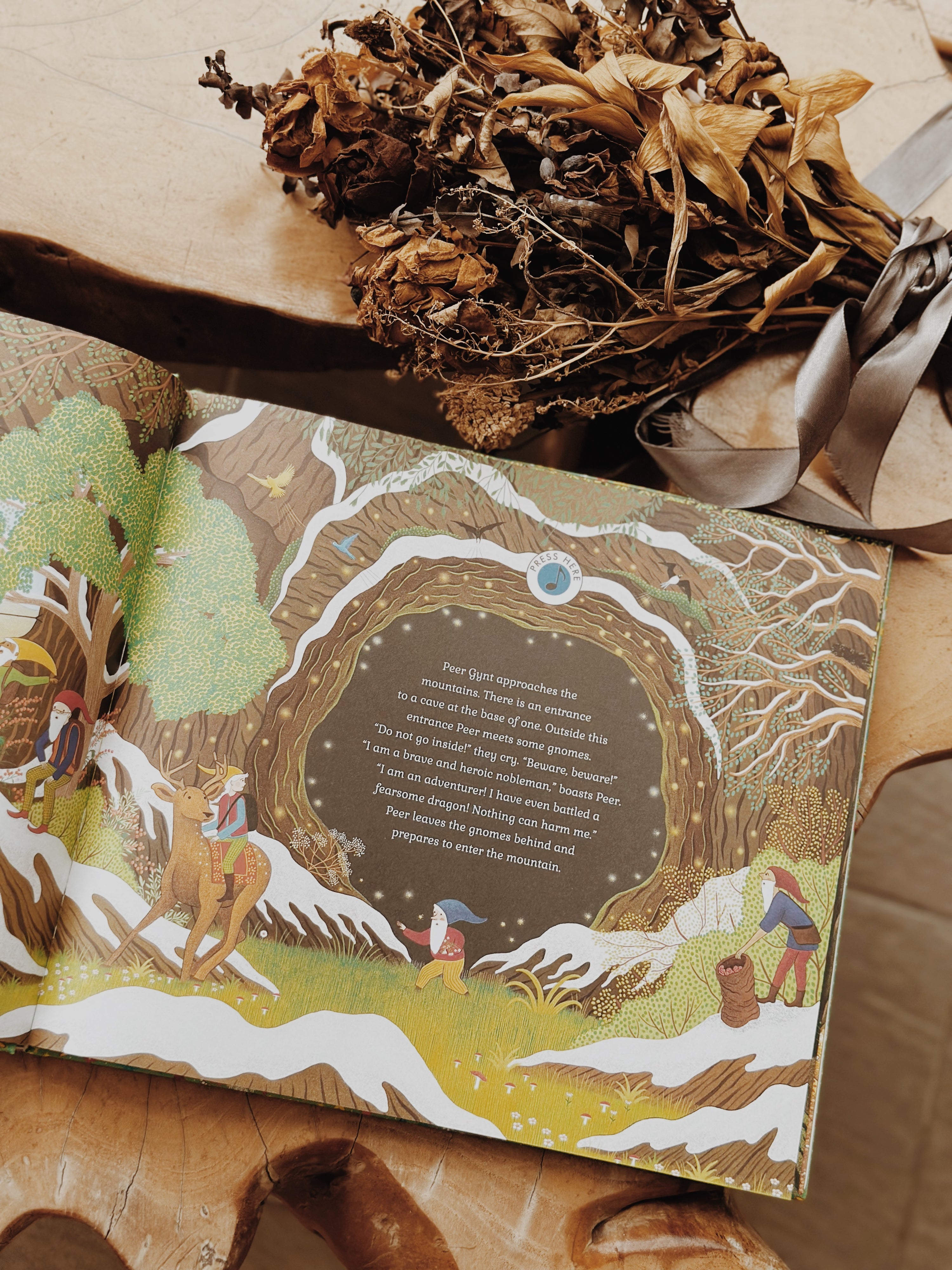 Thisย tale of a boyโs adventure through the valleys and mountains of the Norwegian countrysideย begins at a wedding feast far, far away. Peer Gynt is bored and heโs longing for adventure. After sneaking off from the party, he finds himself at a peaceful lake where he meets some dairy people. When he lies about his escapades riding reindeer through the sky, they dare him to go to the lair of the Mountain King, the king of the trolls.ย The kingโs halls are dark and spooky, and it isnโt long before Peer is captured. How will he escape? And will he learn the importance of humility and the value of friends?