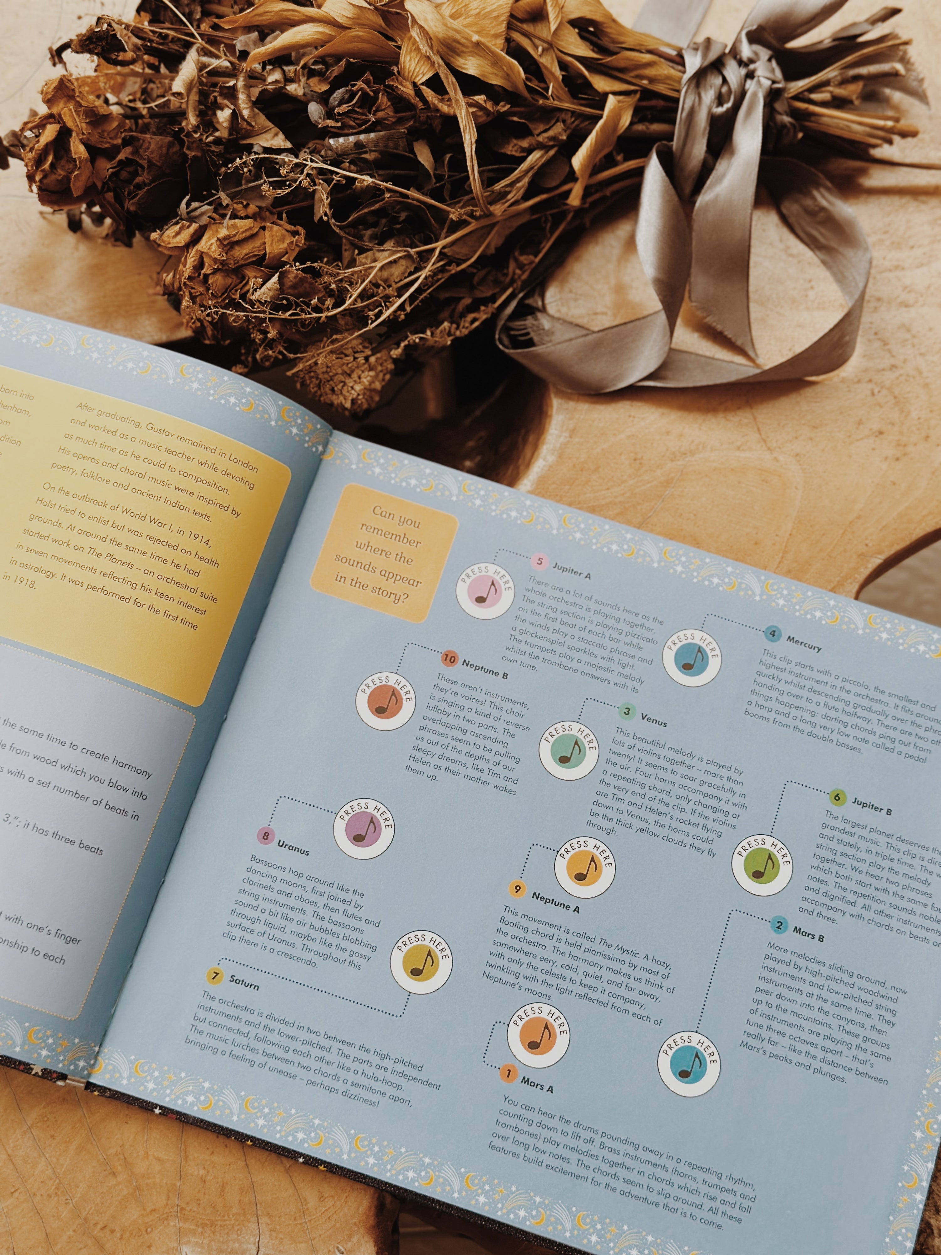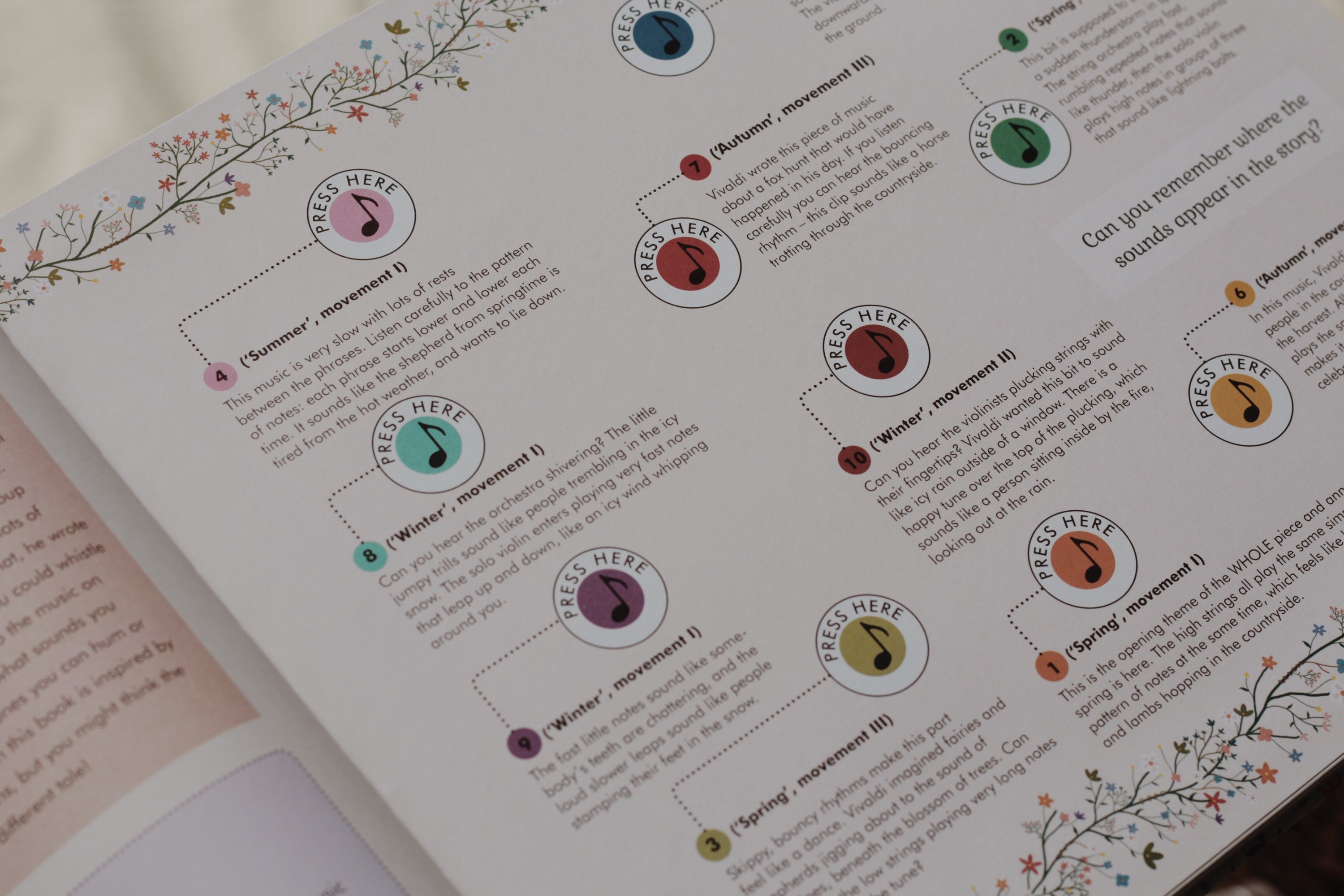 Follow a little girl called Isabelle and her dog, Pickle, as they take on the adventure of a lifetime. As a sign of the changing seasons, Isabelle carries a little apple tree with her, and we see it bud, blossom and lose its leaves. As you and your little one journey through the vibrant scenes illustrated by artist Jessica Courtney-Tickle, you will press the buttons to hear 10 excerpts from The Four Seasons violin concerti.