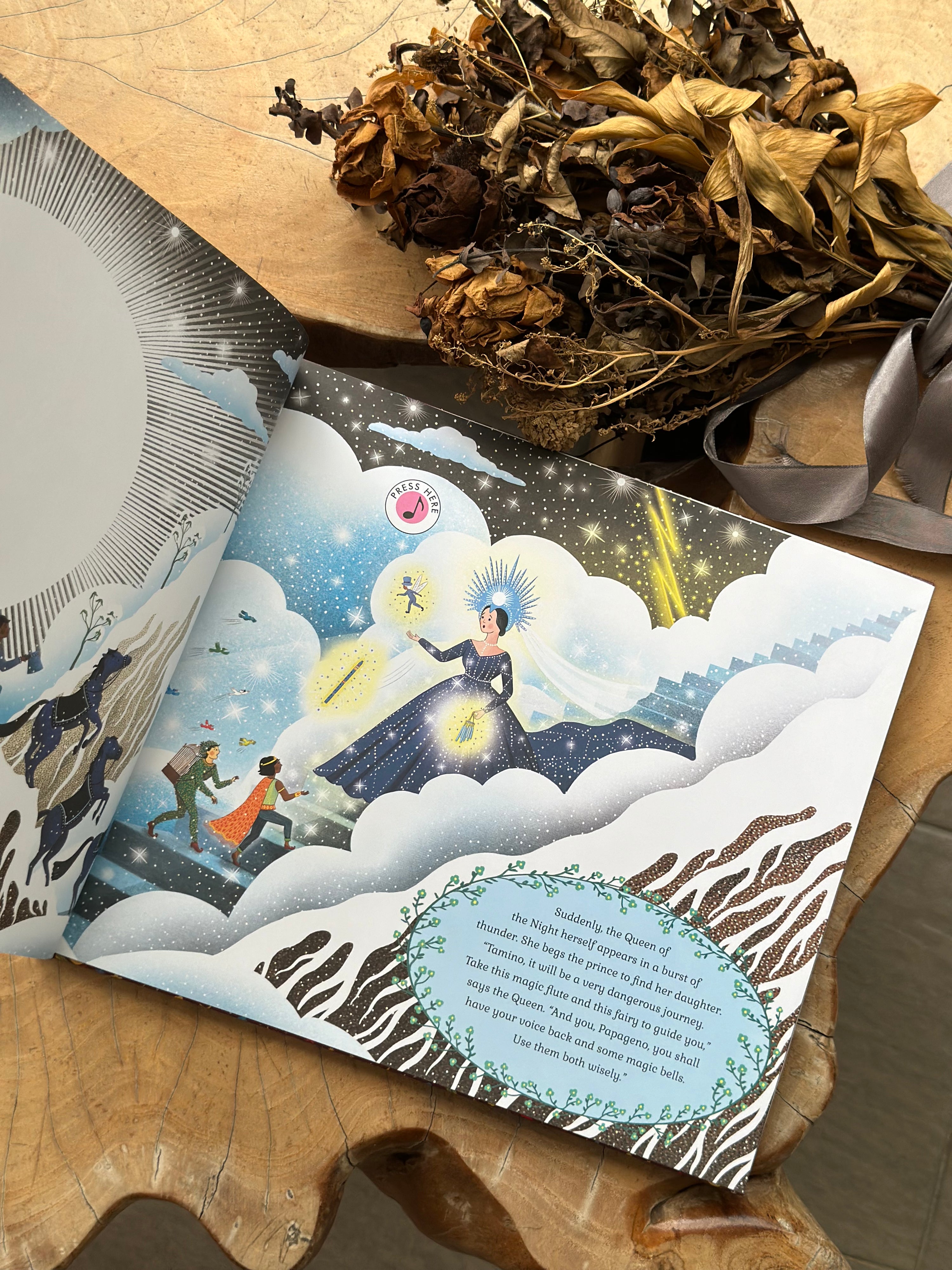 This classic opera, reworked for the benefit of younger readers, tells a tale of a prince, a princess and a magic flute, which begins in a mountain ridge between two magical lands. Prince Tamino enters, chased by a dragon, but three brave mountain rangers gallop past on horseback to rescue him.ย His cowardly friend Papageno comes out from his hiding place and they revive the prince. The rangers ask for one favor in return.ย Their boss, theย Queen of the Night, asks Prince Tamino to rescue her daughter, Princess Pamina, from the evil Sun King. She gives Tamino a magic flute and Papageno some magic bells to help them.ย The story follows Prince Tamino as he breaks into the Sun Kingโs palace, charms the court with his magic flute, and gets caught by the guards. Will the prince escape with the princess?