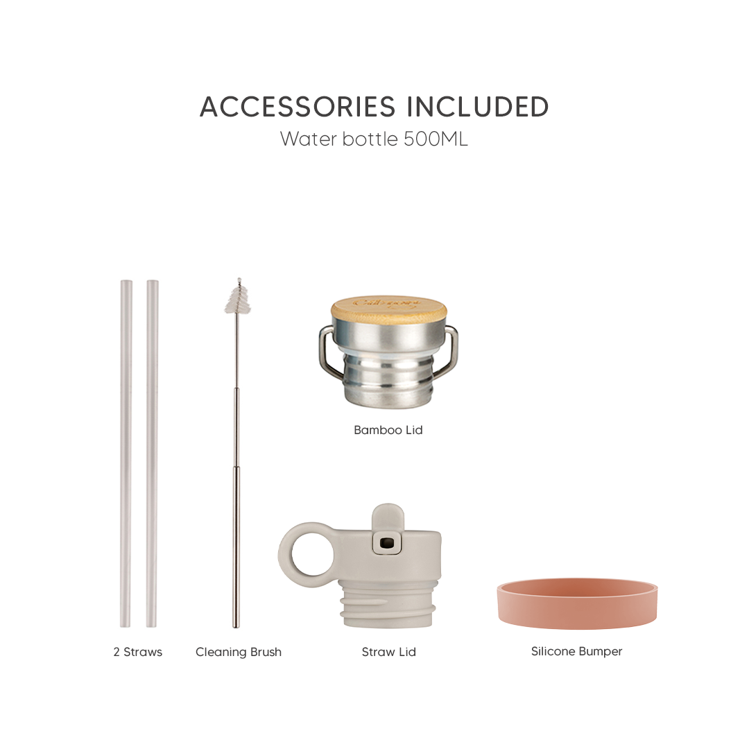 - Included: 1 bottle, 1 cleaning brush, 1 silicone bumper, 1 bamboo lid, 1 straw lid, 1 extra straw