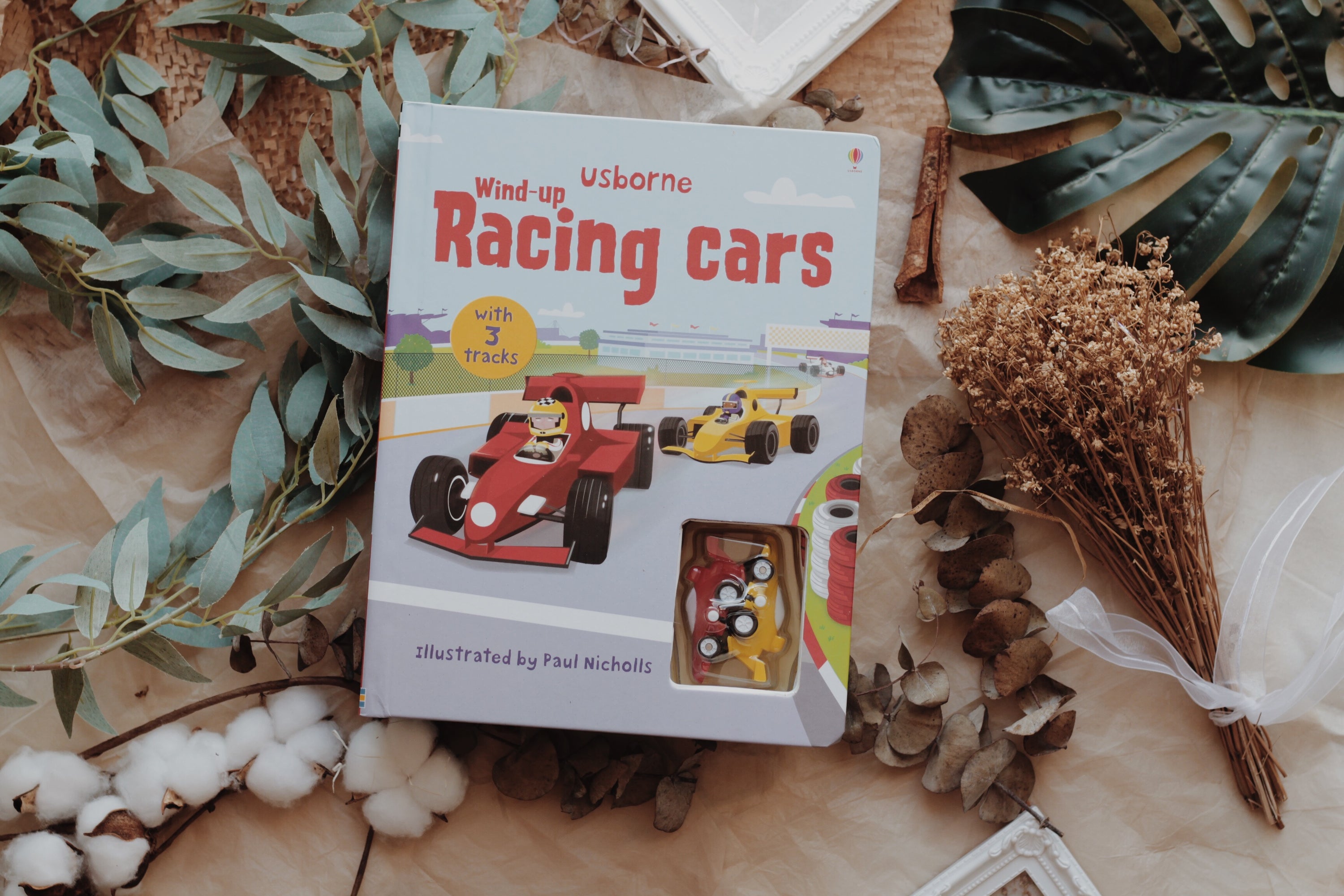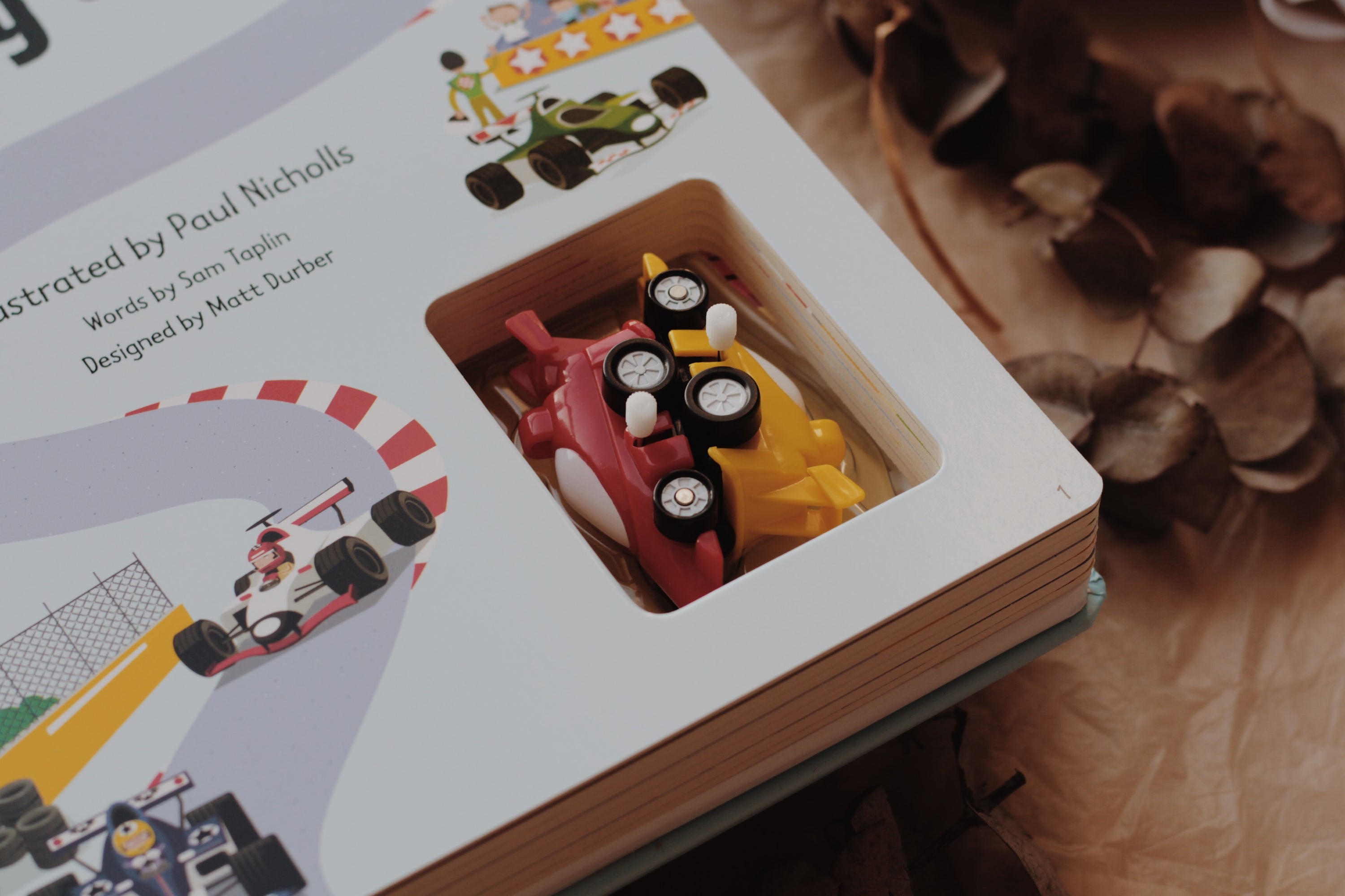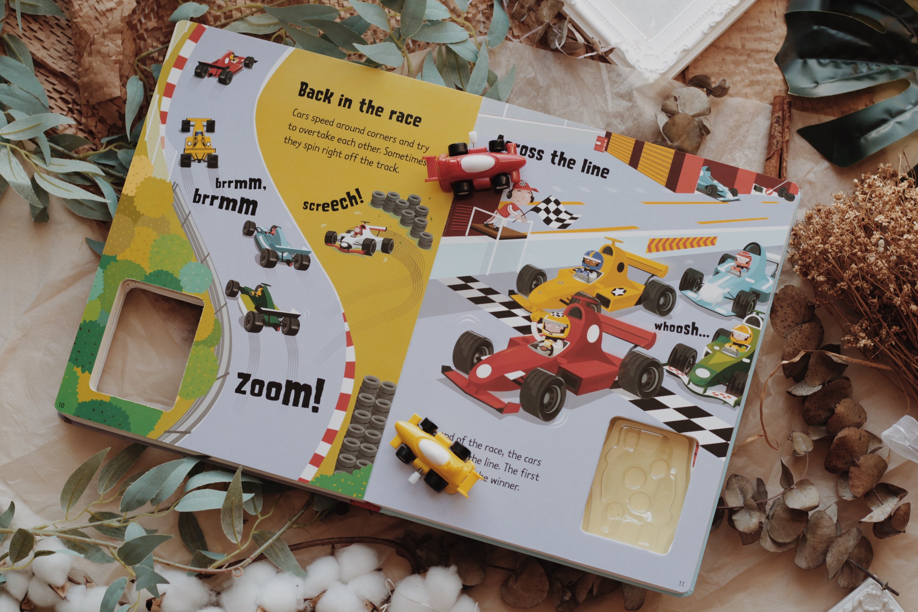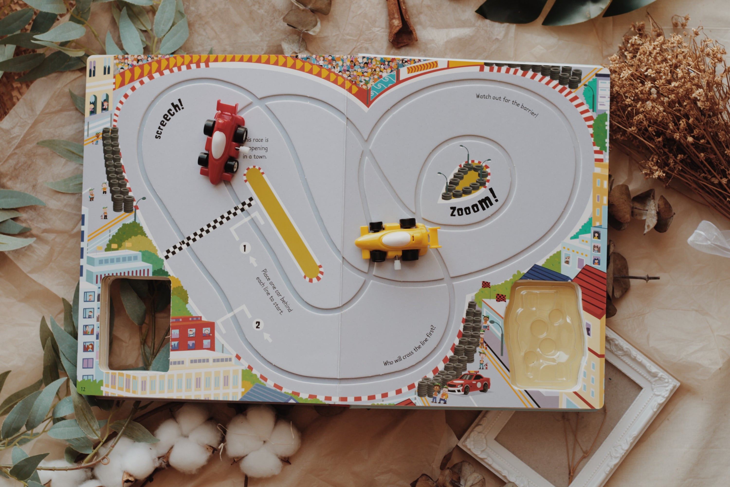 An action-packed book with two wind-up model racing cars to race against each other on the tracks embedded in the thick card pages. With fun facts about racing cars and pit stops and the world of racing.