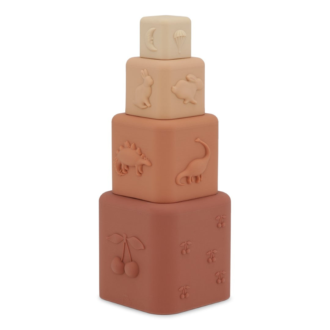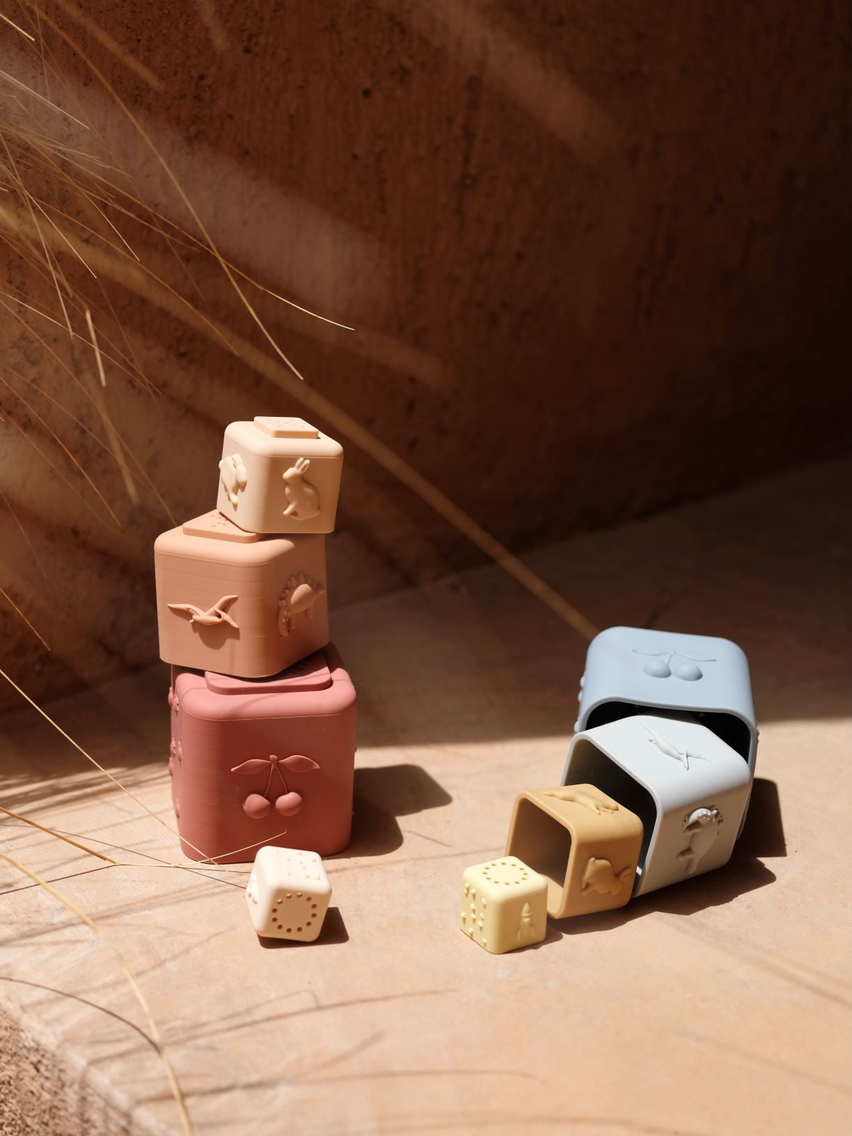 A sturdy stacking tower designed with embossed figures on all four sides. Can also be used in the bath to create “rain” when the water runs through the small holes on top of each block. The toy is designed for children to develop their multi skills.