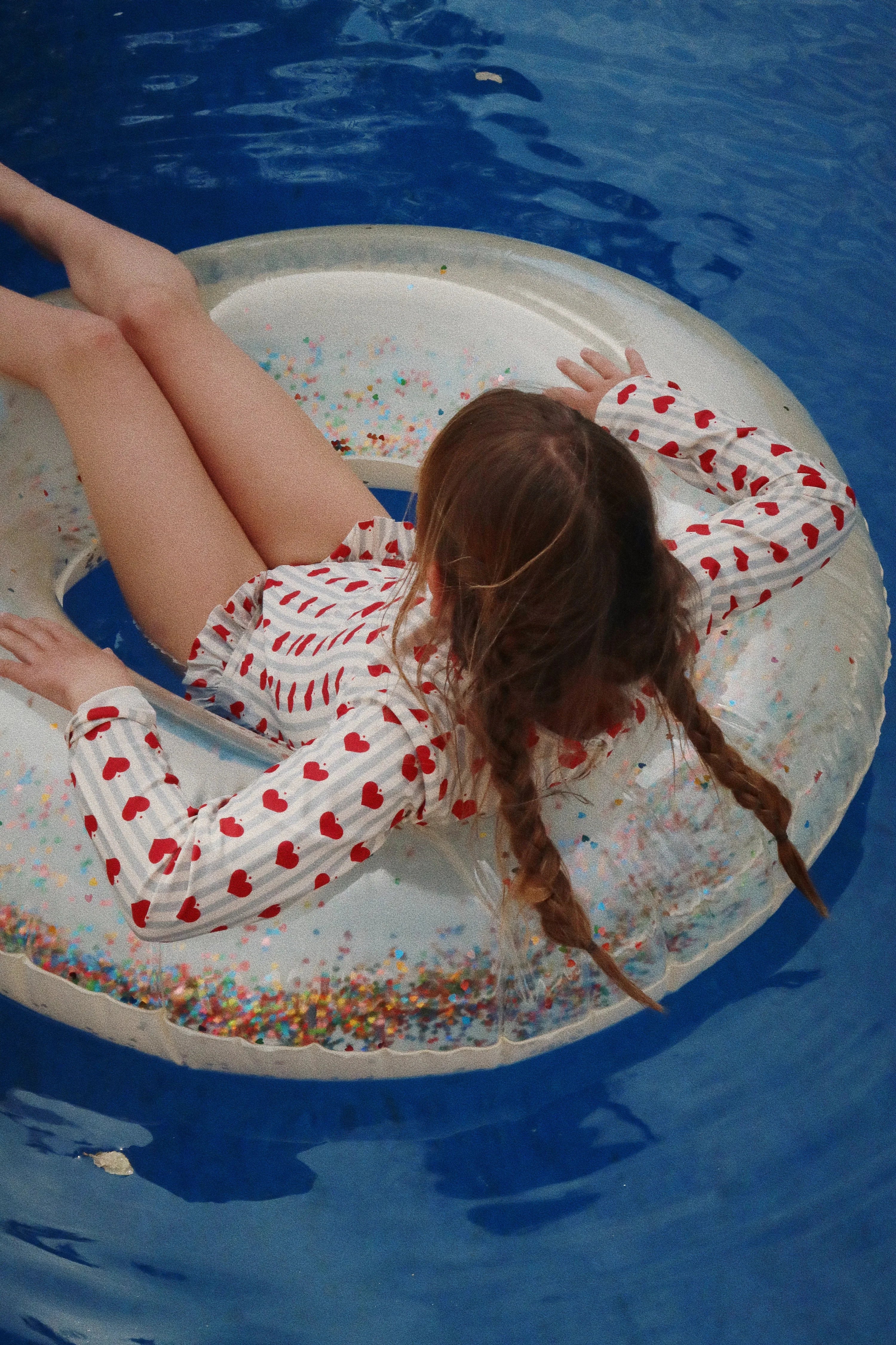 Inflatable transparent float ring made from durable PVC designed with glitter confetti inside.