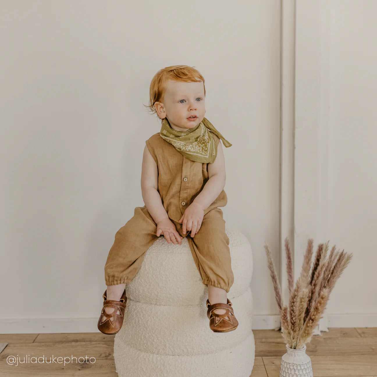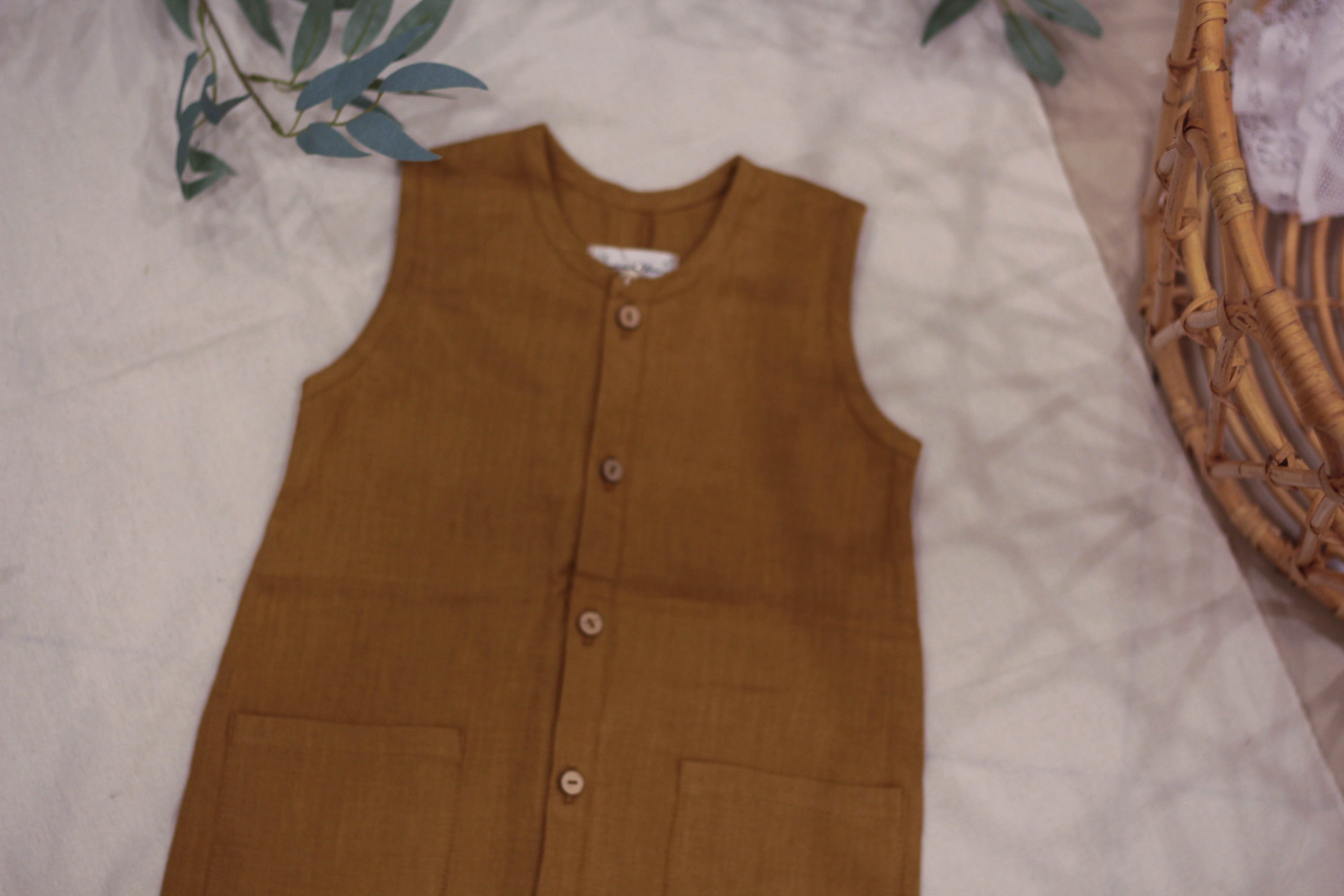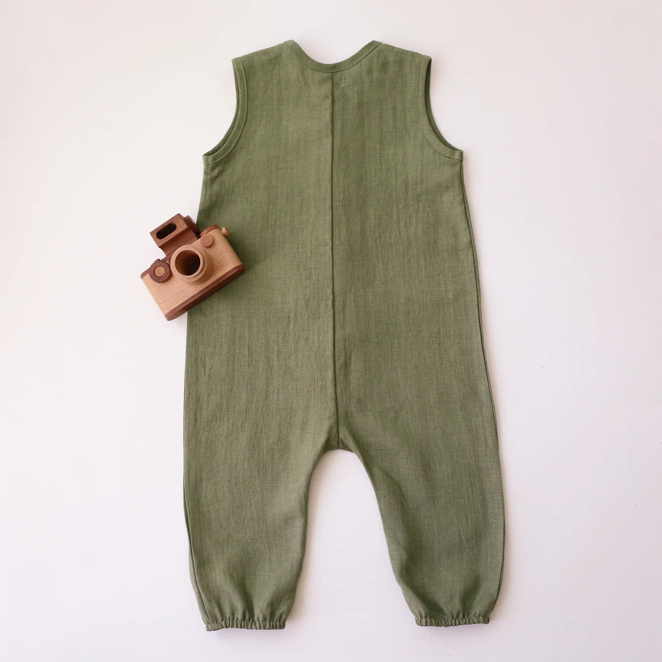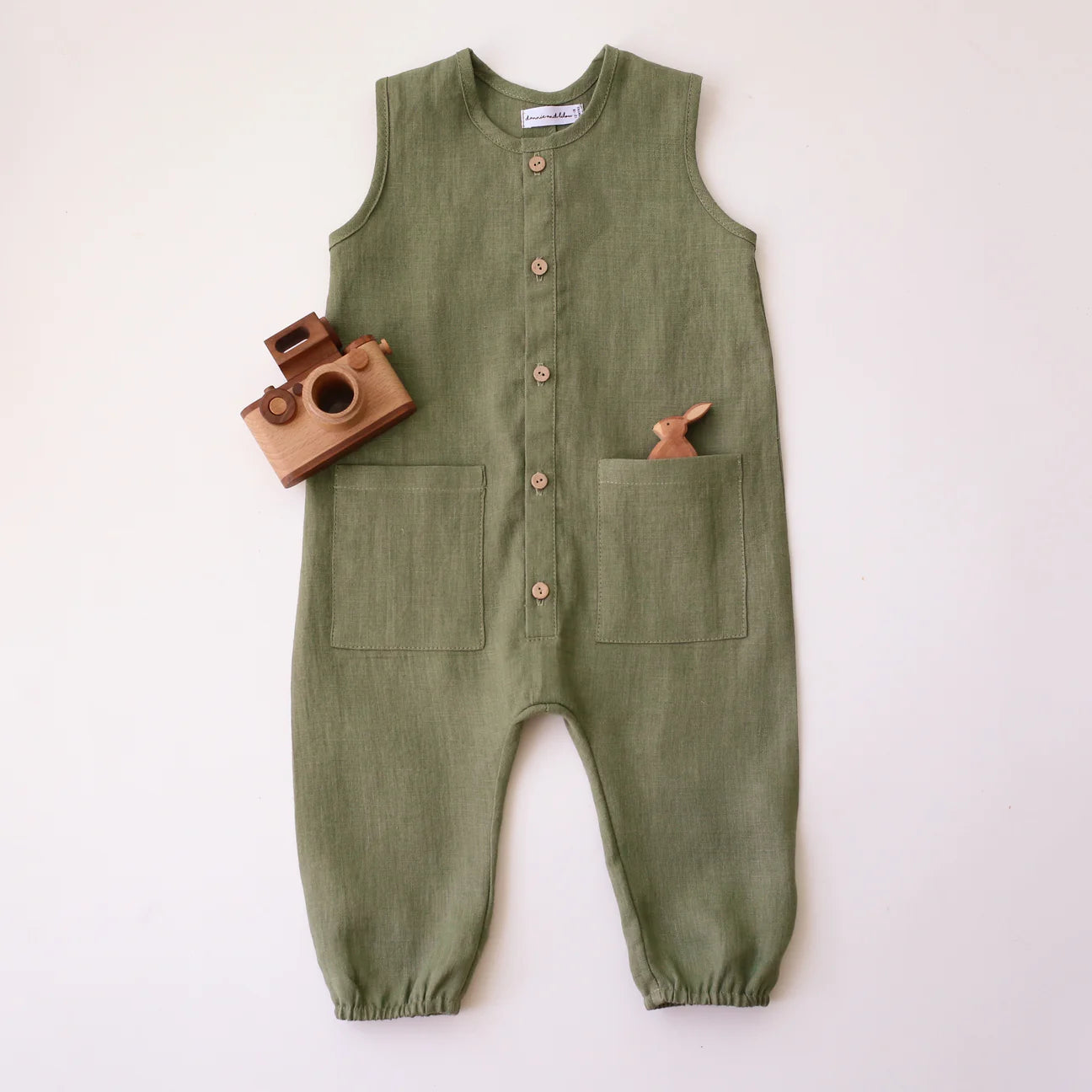This jumpsuit is made of medium weight pre-washed linen fabric. It features side pockets, buttons all over the front fro easy changing.