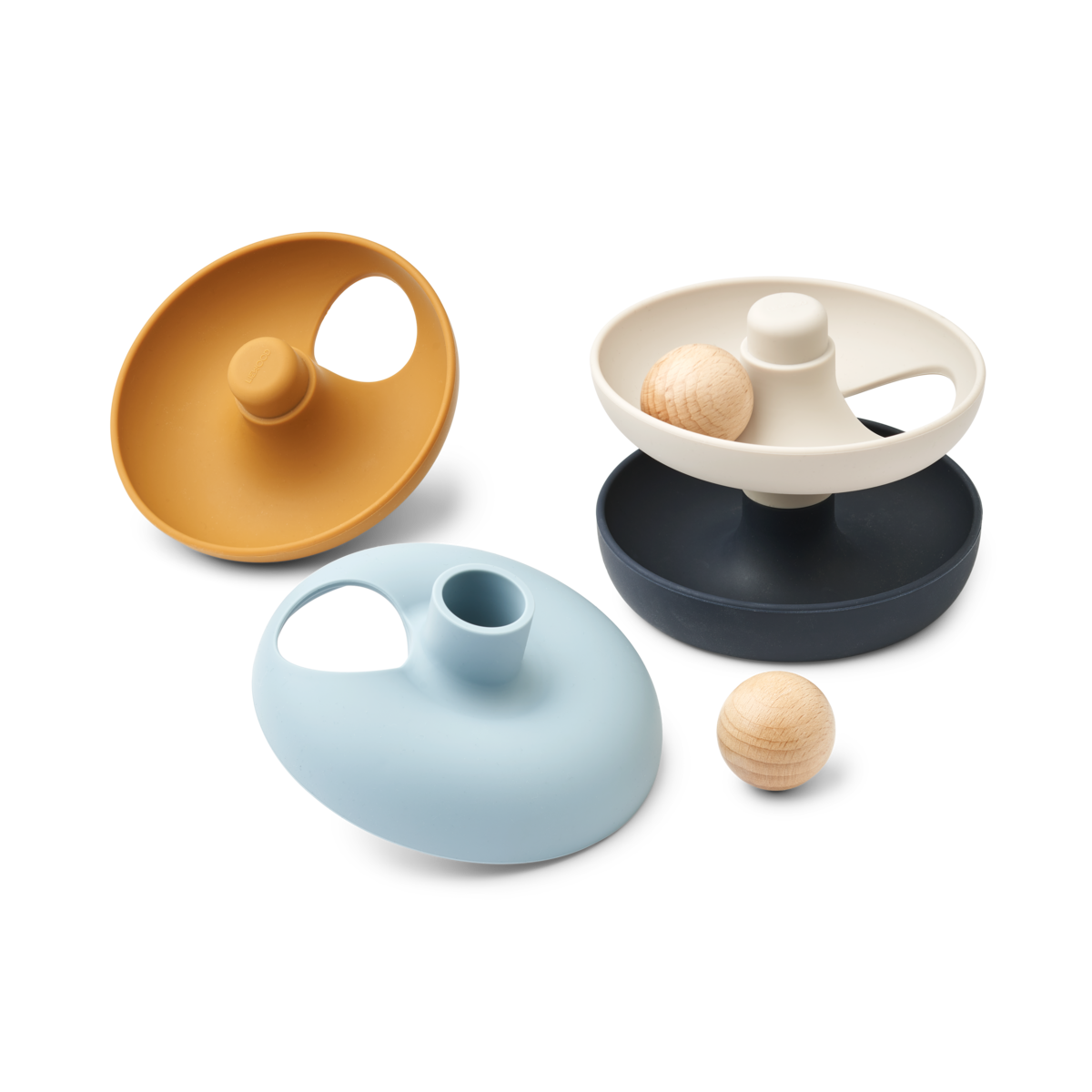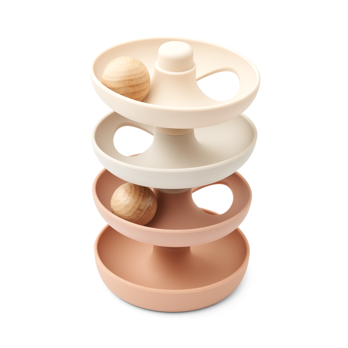 An engaging toy for younger children based on the classic marble run. The Maya ball tower is a simple structure constructed from 4 silicone pieces and includes 2 beech wooden balls to launch and watch as they rattle down the chute. Take apart and use for construction play.