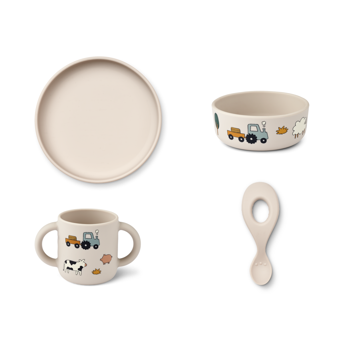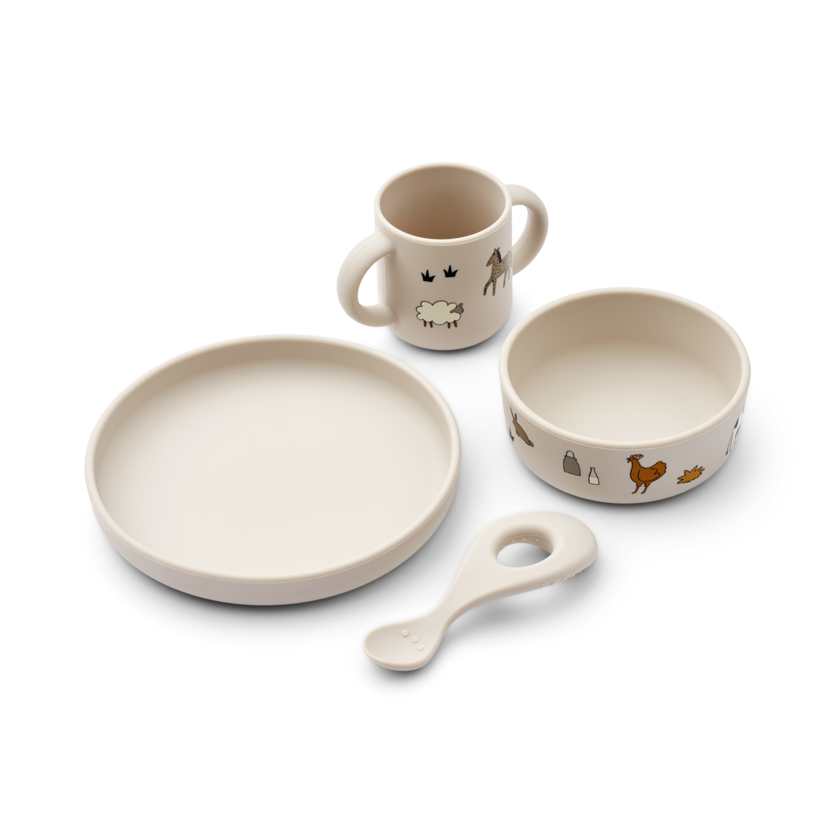 • Set includes: cup, bowl, plate and spoon