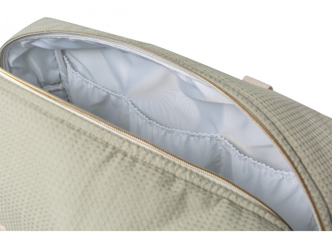 Real maternity suitcase, the Opera waterproof maternity bag is perfect for a stay in maternity ward thanks to its shape and size. Accompany it with the Diva vanity case and the Mozart waterproof changing pad. Do not forget the Victoria maternity suitcase to slip in babyโs things. They all are in 100% organic honeycomb fabric, sophisticated, elegant, and resistant, ideal for maternity things. The honeycomb drawing is exclusive, designed in collaboration with our Barcelona weavers.