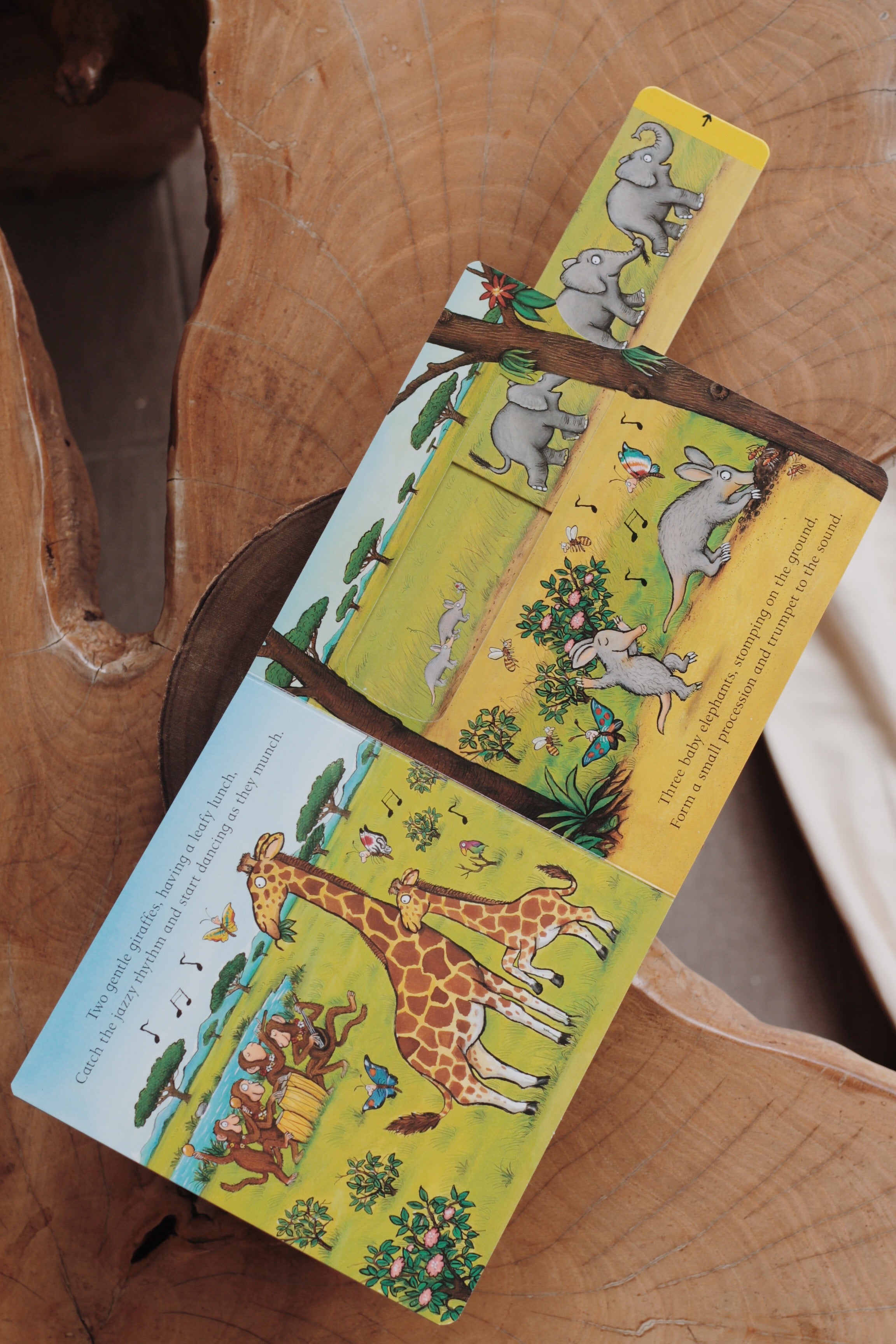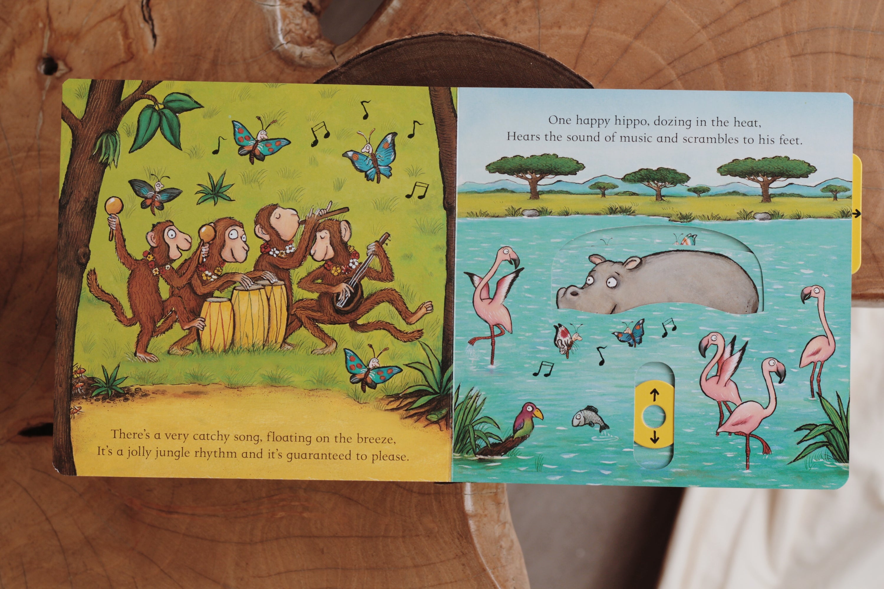 Little ones can join in the fun In the Jungle by pulling out the sliders, pushing up the tabs and counting all the animals! How many lazy lions are yawning? How many zebras are skipping?