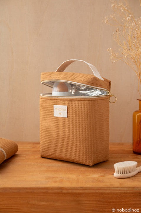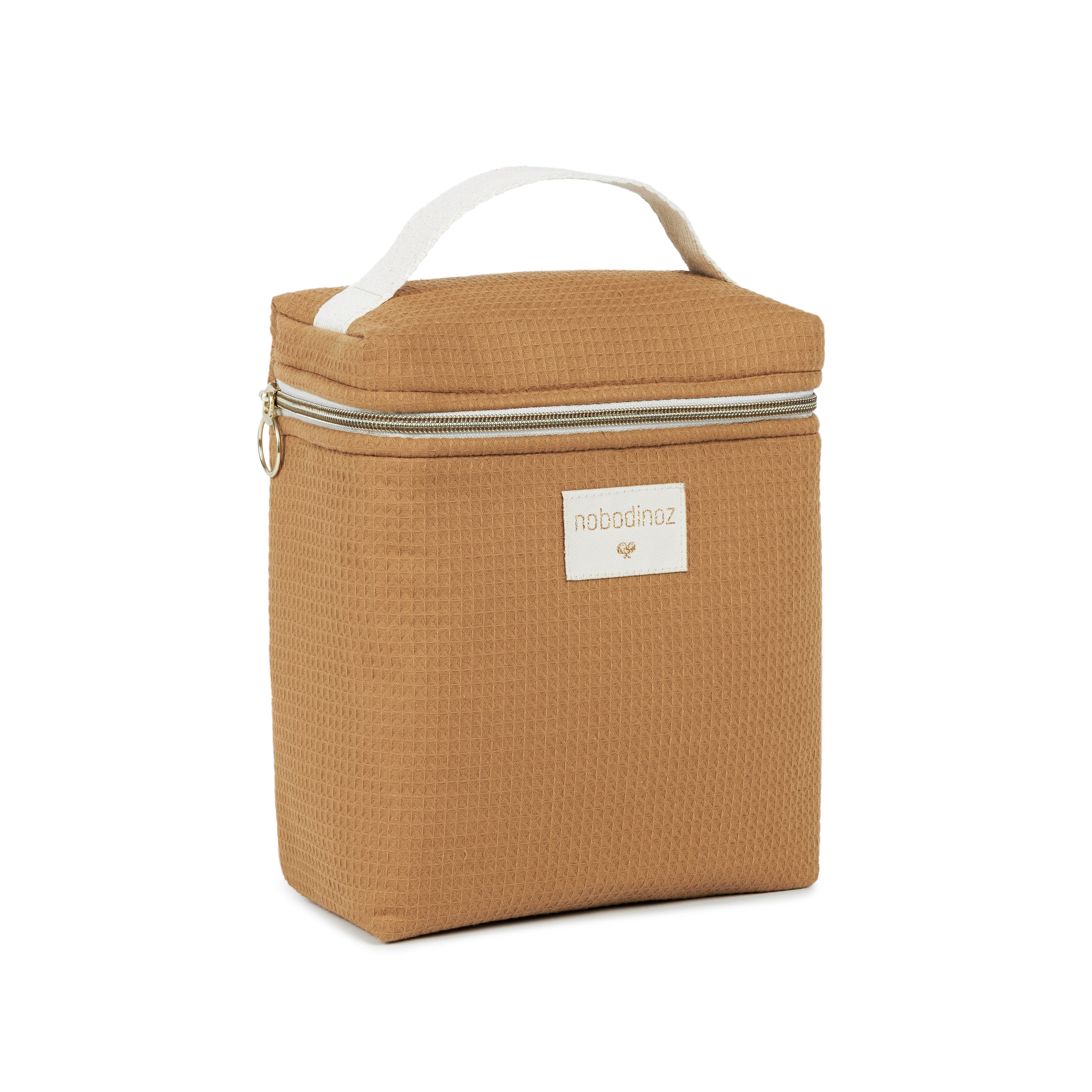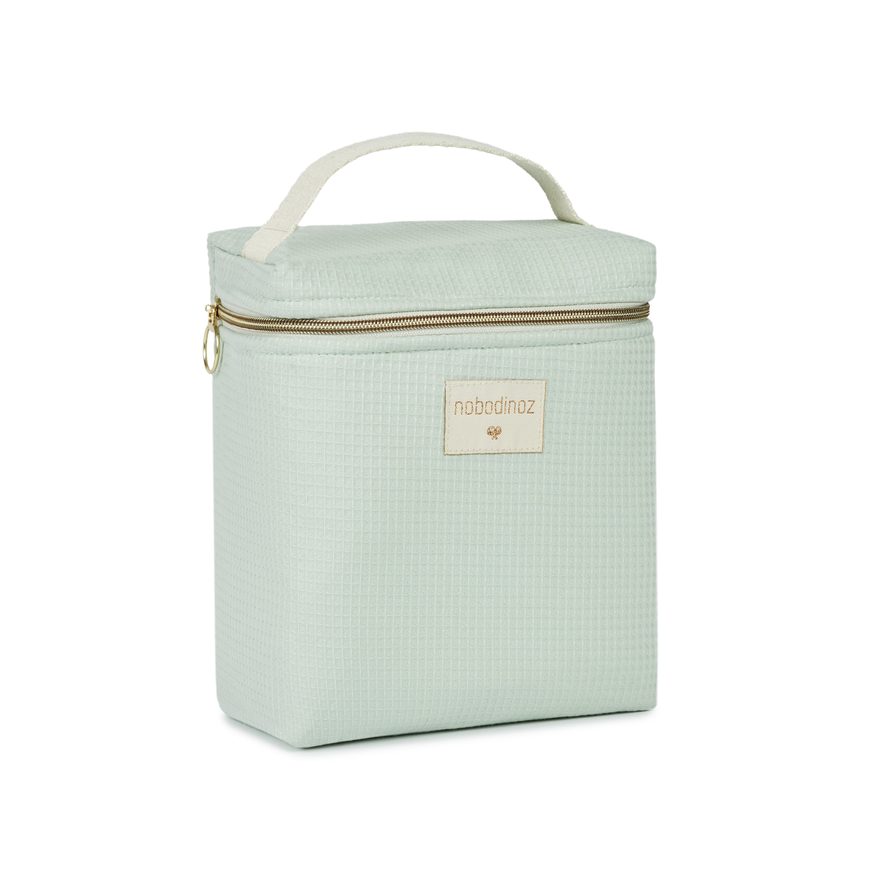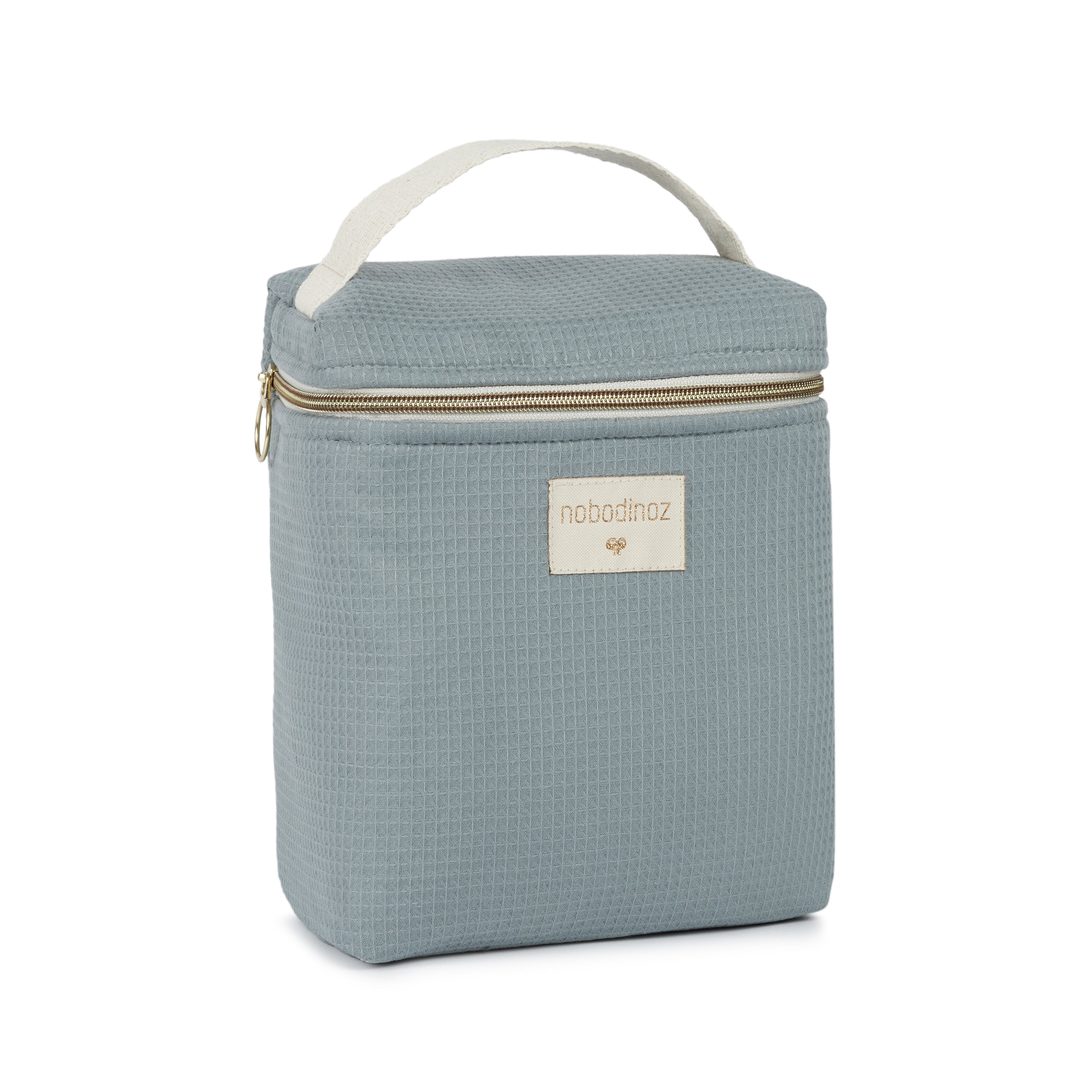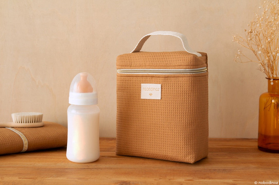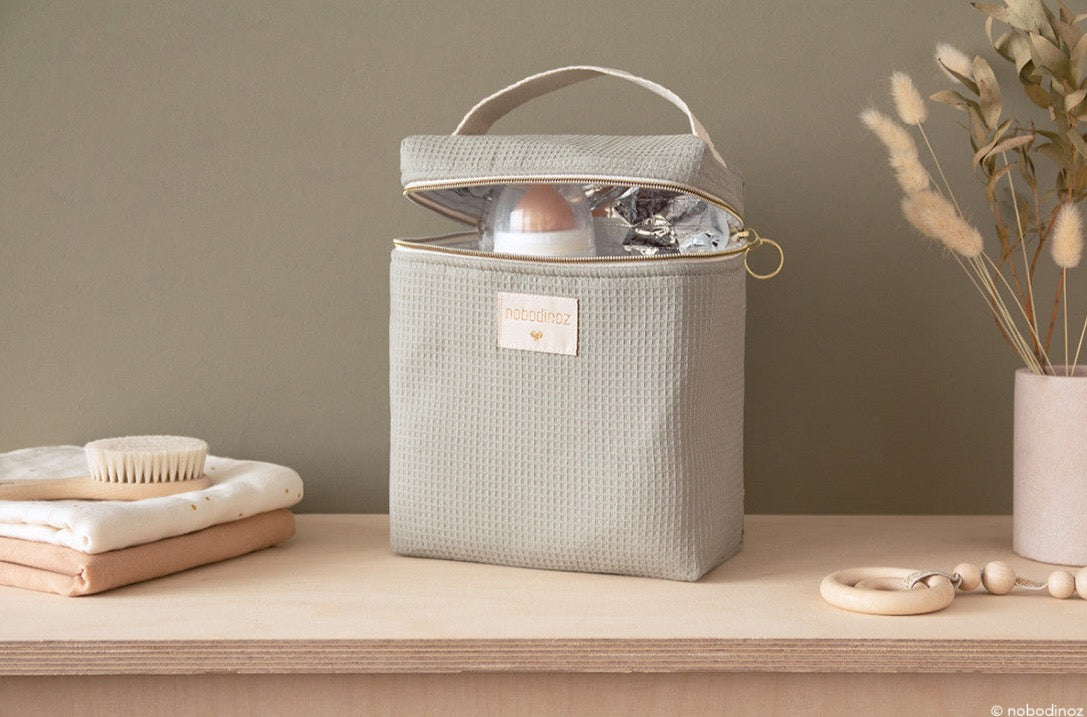 Our Concerto isotherm bag in organic cotton honeycomb already is a must-have. It offers the possibility to bring bottles, bibs, and snacks for your kids, while conserving their initial temperature (cold or hot). You can easily put two bibs and baby food jars. Our 100% organic honeycomb fabric is sophisticated, elegant, and resistant. The honeycomb drawing is exclusive, designed in collaboration with our Barcelona weavers.