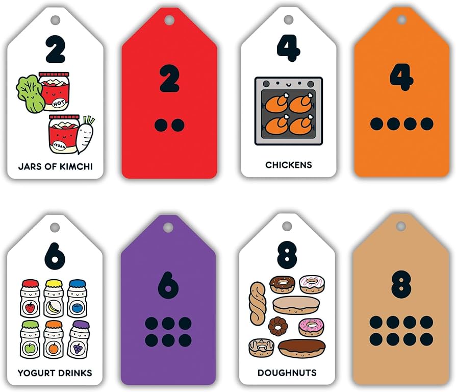 Counting at the Market Numbers Ring Flash Cards from Mudpuppy features 10 extra thick, double-sided cards teaching children ages 1+ numbers 1-10 with fun and colorful images by Mochi Kids, including jars of kimchi, doughnuts, edamame, and more! The re-closable ring makes these sturdy flashcards convenient for on-the-go use, and the cards can be removed from the ring to use for sorting games or to hang as decorations in a nursery or classroom.