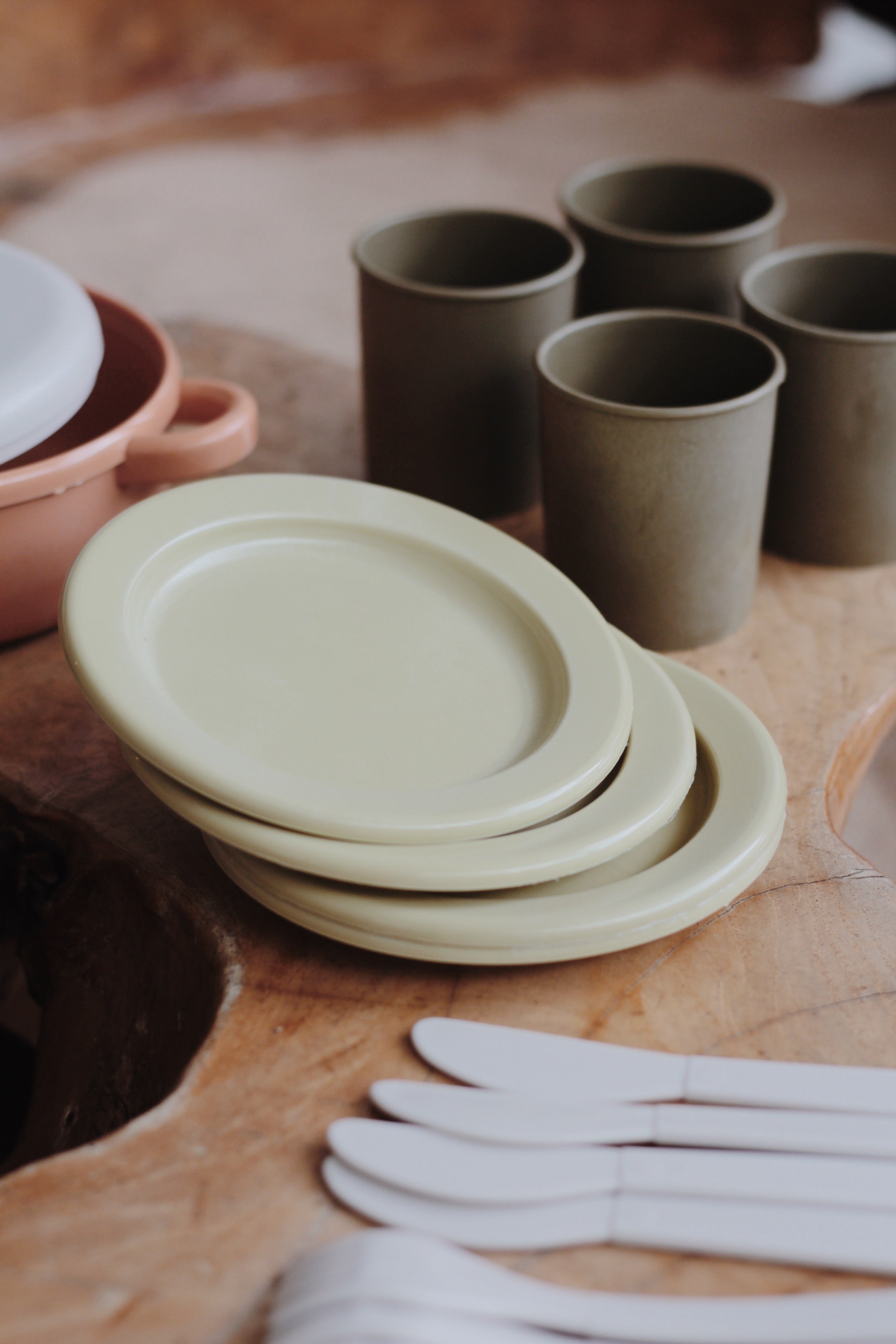 Complete dinner set with pots and cutlery in lovely trendy colours, made of Nordic Swan Ecolabelled bioplastic, 4 place settings. This dinner set invites play and learning and is perfect for both indoor and outdoor use.