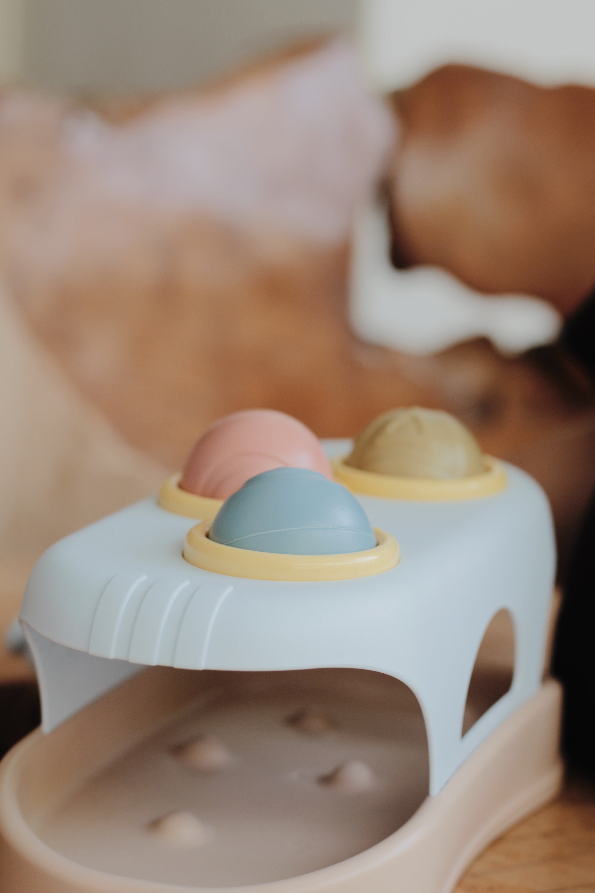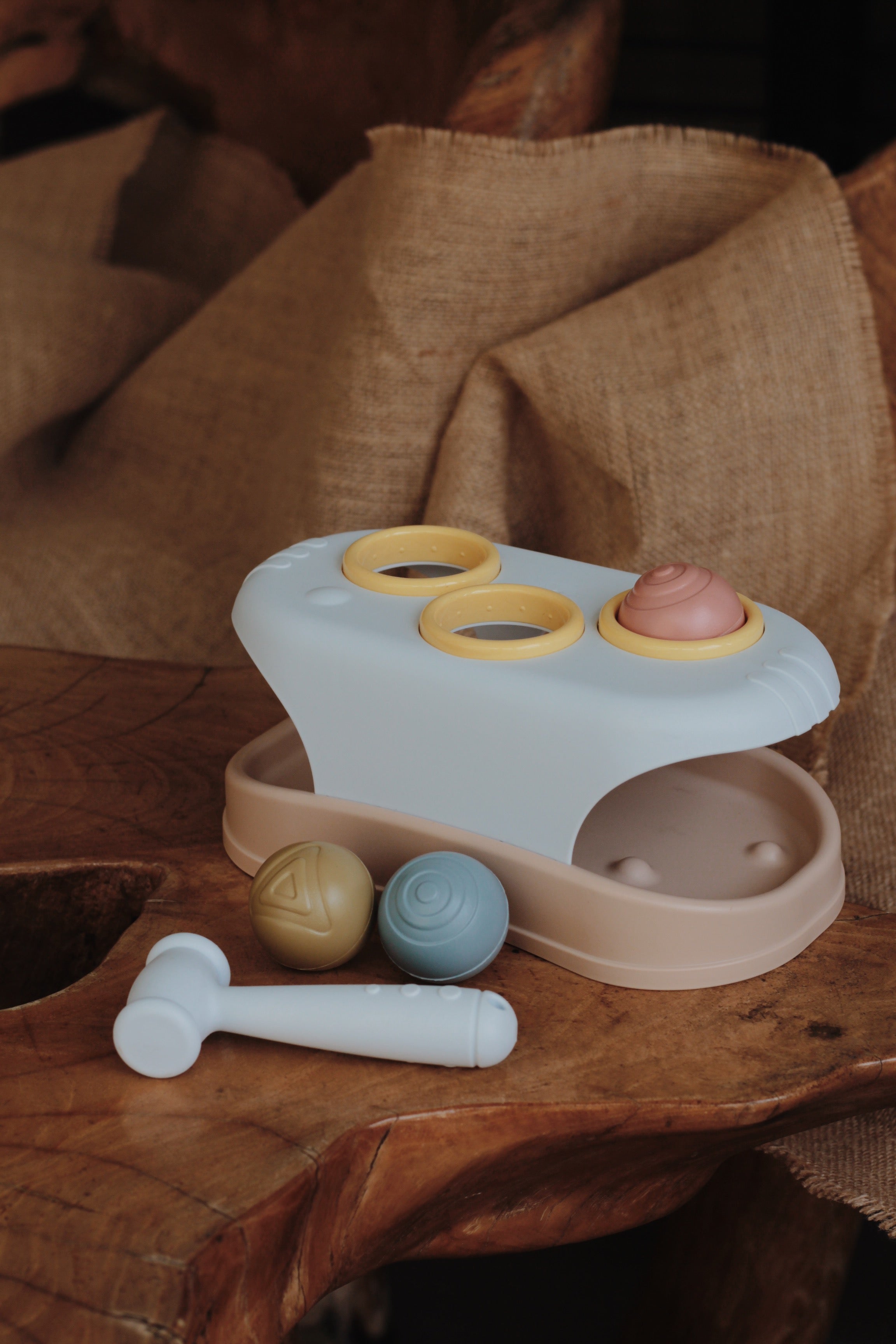 Pounding bench in beautiful subdued natural shades, which stimulates the fine motor skills and invites play and learning. Made of Nordic Swan Ecolabelled bioplastic.